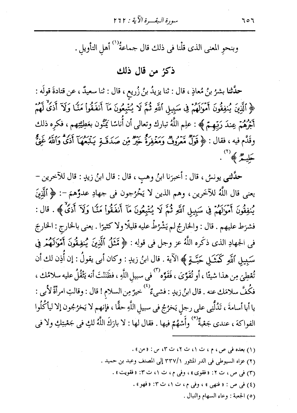 حَدَّثَنِي يُونُسُ، قَالَ: أَخْبَرَنَا ابْنُ وَهْبٍ، قَالَ: قَالَ ابْنُ زَيْدٍ: قَالَ لِلْآخَرِينَ يَعْنِي: قَالَ اللَّهُ لِلْآخَرِينَ، وَهُمُ الَّذِينَ لَا يَخْرُجُونَ فِي جِهَادِ عَدُوِّهِمْ: §الَّذِينَ يُنْفِقُونَ أَمْوَالَهُمْ فِي سَبِيلِ اللَّهِ، ثُمَّ لَا يُتْبِعُونَ مَا أَنْفَقُوا مَنًّا وَلَا أَذًى، قَالَ: " فَشَرَطَ عَلَيْهِمْ قَالَ: " وَالْخَارِجُ لَمْ يَشْرُطْ عَلَيْهِ قَلِيلًا وَلَا كَثِيرًا، يَعْنِي بِالْخَارِجِ الْخَارِجَ فِي الْجِهَادِ الَّذِي ذَكَرَ اللَّهُ فِي قَوْلِهِ: {مَثَلُ الَّذِينَ يُنْفِقُونَ أَمْوَالَهُمْ فِي سَبِيلِ اللَّهِ كَمَثَلِ حَبَّةٍ} [البقرة: 261] " الْآيَةَ قَالَ ابْنُ زَيْدٍ: وَكَانَ أَبِي يَقُولُ: «إِنْ أُذِنَ لَكَ أَنْ تُعْطِيَ مِنْ هَذَا شَيْئًا، أَوْ تَقْوَى فَقَوَّيْتَ فِي سَبِيلِ اللَّهِ، فَظَنَنْتَ أَنَّهُ يَثْقُلُ عَلَيْهِ سَلَامُكَ فَكُفَّ سَلَامَكَ عَنْهُ» قَالَ ابْنُ زَيْدٍ: «فَهُوَ خَيْرٌ مِنَ السَّلَامِ» قَالَ: " وَقَالَتِ امْرَأَةٌ لِأُبَيٍّ: يَا أَبَا أُسَامَةَ، تَدُلُّنِي عَلَى رَجُلٍ يَخْرُجُ فِي سَبِيلِ اللَّهِ حَقًّا، فَإِنَّهُمْ لَا يَخْرُجُونَ إِلَّا لِيَأْكُلُوا الْفَوَاكِهَ، عِنْدِي جَعْبَةٌ وَأَسْهُمٌ فِيهَا، فَقَالَ لَهَا: لَا بَارَكَ اللَّهُ لَكِ فِي جَعْبَتِكِ، وَلَا فِي
