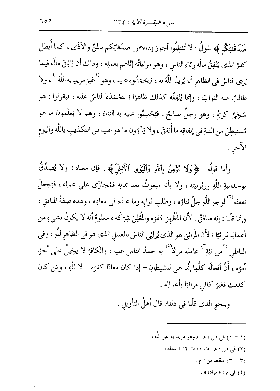 صَدَقَاتِكُمْ} [البقرة: 264] ، يَقُولُ: لَا تُبْطِلُوا أُجُورَ صَدَقَاتِكُمْ {بِالْمَنِّ وَالْأَذَى} [البقرة: 264] ، كَمَا أَبْطَلَ كُفْرُ الَّذِي يُنْفِقُ مَالَهُ {رِئَاءَ النَّاسِ} [البقرة: 264] ، وَهُوَ مُرَاءَاتُهُ إِيَّاهُمْ بِعَمَلِهِ؛ وَذَلِكَ أَنْ يُنْفِقَ مَالَهُ فِيمَا يَرَى النَّاسُ فِي الظَّاهِرِ أَنَّهُ يُرِيدُ اللَّهَ تَعَالَى ذِكْرُهُ فَيَحْمَدُونَهُ عَلَيْهِ وَهُوَ مَرِيدٌ بِهِ غَيْرَ اللَّهِ وَلَا طَالِبٌ مِنْهُ الثَّوَابَ وَإِنَّمَا يُنْفِقُهُ كَذَلِكَ ظَاهِرًا لِيَحْمَدَهُ النَّاسُ عَلَيْهِ فَيَقُولُوا: هُوَ سَخِيُّ كَرِيمٌ، وَهُوَ رَجُلٌ صَالِحٌ، فَيُحْسِنُوا عَلَيْهِ بِهِ الثَّنَاءَ وَهُمْ لَا يَعْلَمُونَ مَا هُوَ مُسْتَبْطِنٌ مِنَ النِّيَّةِ فِي إِنْفَاقِهِ مَا أَنْفَقَ، فَلَا يَدْرُونَ مَا هُوَ عَلَيْهِ مِنَ التَّكْذِيبِ بِاللَّهِ تَعَالَى ذِكْرُهُ وَالْيَوْمِ الْآخِرِ. وَأَمَّا قَوْلُهُ: {وَلَا يُؤْمِنُ بِاللَّهِ وَالْيَوْمِ الْآخِرِ} [البقرة: 264] فَإِنَّ مَعْنَاهُ: وَلَا يُصَدِّقُ بِوَحْدَانِيَّةِ اللَّهِ وَرُبُوبِيَّتِهِ، وَلَا بِأَنَّهُ مَبْعُوثٌ بَعْدَ مَمَاتِهِ فَمُجَازًى عَلَى عَمَلِهِ، فَيَجْعَلُ عَمَلَهُ لِوَجْهِ اللَّهِ وَطَلَبِ ثَوَابِهِ وَمَا عِنْدَهُ فِي مَعَادِهِ، وَهَذِهِ صِفَةُ الْمُنَافِقِ؛ وَإِنَّمَا قُلْنَا إِنَّهُ مُنَافِقٌ، لِأَنَّ الْمُظْهِرَ كَفَرَهُ وْالْمُعْلِنَ شِرْكَهَ مَعْلُومٌ أَنَّهُ لَا يَكُونُ بِشَيْءٍ مِنْ أَعْمَالِهِ مُرَائِيًا، لِأَنَّ الْمَرَائِيَّ هُوَ الَّذِي يُرَائِي النَّاسَ بِالْعَمَلِ الَّذِي هُوَ فِي الظَّاهِرِ لِلَّهِ وَفِي الْبَاطِنِ عَامِلُهُ مُرَادُهُ بِهِ حَمْدُ النَّاسِ عَلَيْهِ، وَالْكَافِرُ لَا يَخِيلُ عَلَى أَحَدٍ أَمْرُهُ أَنَّ أَفْعَالَهُ كُلَّهَا إِنَّمَا هِيَ لِلشَّيْطَانِ إِذَا كَانَ مُعْلِنًا كُفْرَهُ لَا لِلَّهِ، وَمَنْ كَانَ كَذَلِكَ فَغَيْرُ كَائِنٍ مُرَائِيًا بِأَعْمَالِهِ. وَبِنَحْوِ مَا قُلْنَا فِي ذَلِكَ قَالَ أَهْلُ التَّأْوِيلِ
