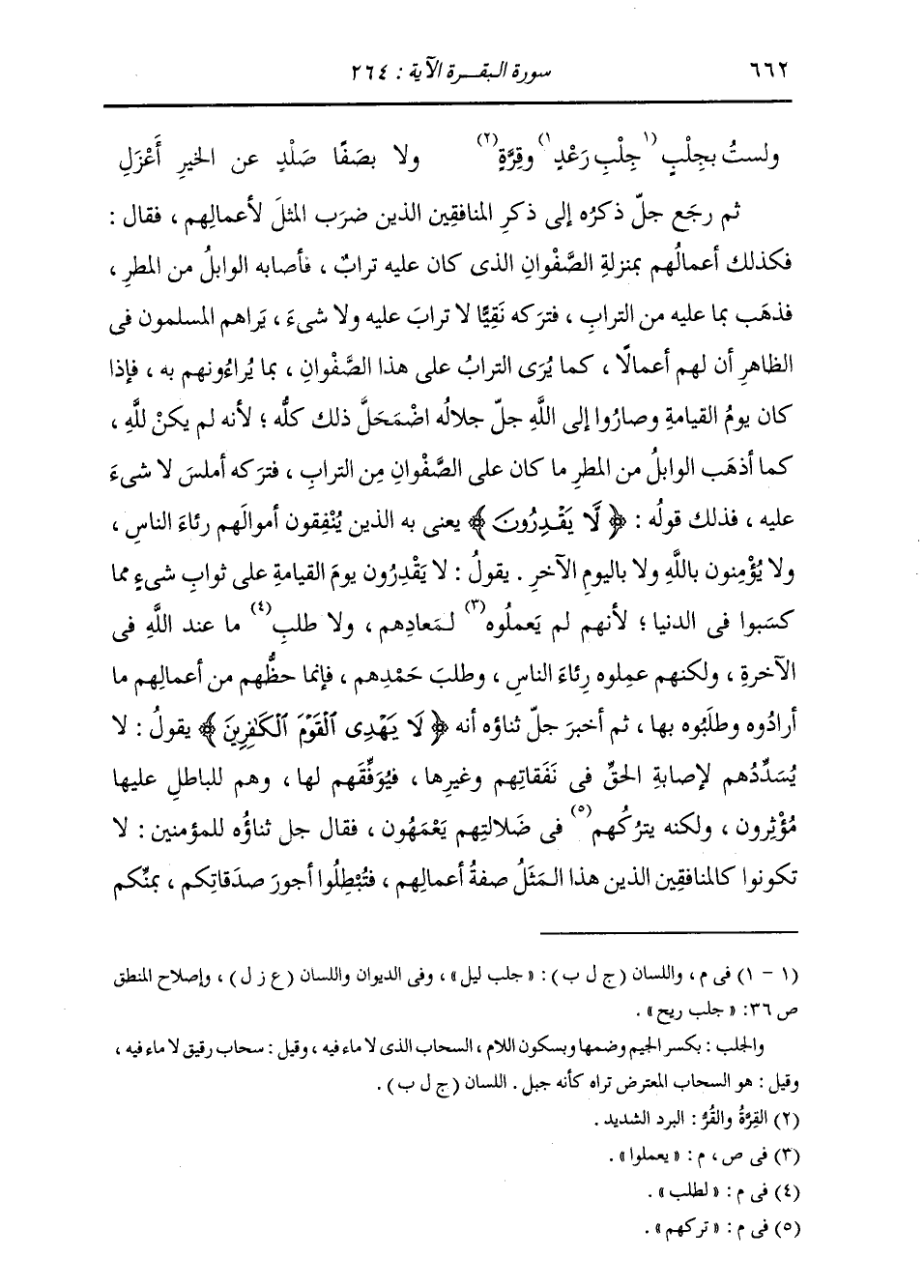 ثُمَّ رَجَعَ تَعَالَى ذِكْرُهُ إِلَى ذِكْرِ الْمُنَافِقِينَ الَّذِينَ ضَرَبَ الْمَثَلَ لِأَعْمَالِهِمْ، فَقَالَ: فَكَذَلِكَ أَعْمَالُهُمْ بِمَنْزِلَةِ الصَّفْوَانِ الَّذِي كَانَ عَلَيْهِ تُرَابٌ، فَأَصَابَهُ الْوَابِلُ مِنَ الْمَطَرِ، فَذَهَبَ بِمَا عَلَيْهِ مِنَ التُّرَابِ، فَتَرَكَهُ نَقِيًّا لَا تُرَابَ عَلَيْهِ وَلَا شَيْءَ، يَرَاهُمُ الْمُسْلِمُونَ فِي الظَّاهِرِ أَنَّ لَهُمُ أَعْمَالًا كَمَا يُرَى التُّرَابُ عَلَى هَذَا الصَّفْوَانِ بِمَا يُرَاءُونَهُمْ بِهِ، فَإِذَا كَانَ يَوْمُ الْقِيَامَةِ وَصَارُوا إِلَى اللَّهِ اضْمَحَلَّ ذَلِكَ كُلُّهُ؛ لِأَنَّهُ لَمْ يَكُنْ لِلَّهِ كَمَا ذَهَبَ الْوَابِلُ مِنَ الْمَطَرِ بِمَا كَانَ عَلَى الصَّفْوَانِ مِنَ التُّرَابِ، فَتَرَكَهُ أَمْلَسَ لَا شَيْءَ عَلَيْهِ، فَذَلِكَ قَوْلُهُ: {لَا يَقْدِرُونَ} [البقرة: 264] ، يَعْنِي بِهِ الَّذِينَ يُنْفِقُونَ أَمْوَالَهُمْ رِئَاءَ النَّاسِ، وَلَا يُؤْمِنُونَ بِاللَّهِ وَلَا بِالْيَوْمِ الْآخِرِ، يَقُولُ: لَا يَقْدِرُونَ يَوْمَ الْقِيَامَةِ عَلَى ثَوَابِ شَيْءٍ مِمَّا كَسَبُوا فِي الدُّنْيَا؛ لِأَنَّهُمْ لَمْ يَعْمَلُوا لِمَعَادِهِمْ وَلَا لِطَلَبِ مَا عِنْدَ اللَّهِ فِي الْآخِرَةِ، وَلَكِنَّهُمْ عَمِلُوهُ رِئَاءَ النَّاسِ وَطَلَبَ حَمْدِهِمْ، وَإِنَّمَا حَظُّهُمْ مِنْ أَعْمَالِهِمْ مَا أَرَادُوهُ وَطَلَبُوهُ بِهَا. ثُمَّ أَخْبَرَ تَعَالَى ذِكْرُهُ أَنَّهُ لَا يَهْدِي الْقَوْمَ الْكَافِرِينَ، يَقُولُ: لَا يُسَدِّدُهُمْ لِإِصَابَةِ الْحَقِّ فِي نَفَقَاتِهِمْ وَغَيْرِهَا فَيُوَفِّقُهُمْ لَهَا، وَهُمْ لِلْبَاطِلِ عَلَيْهَا مُؤْثِرُونَ، وَلَكِنَّهُ تَرَكَهُمْ فِي ضَلَالَتِهِمْ يَعْمَهُونَ، فَقَالَ تَعَالَى ذِكْرُهُ لِلْمُؤْمِنِينَ: لَا تَكُونُوا كَالْمُنَافِقِينَ الَّذِينَ هَذَا الْمَثَلُ صِفَةُ أَعْمَالِهِمْ، فَتُبْطِلُوا أُجُورَ صَدَقَاتِكُمْ بِمَنِّكُمْ