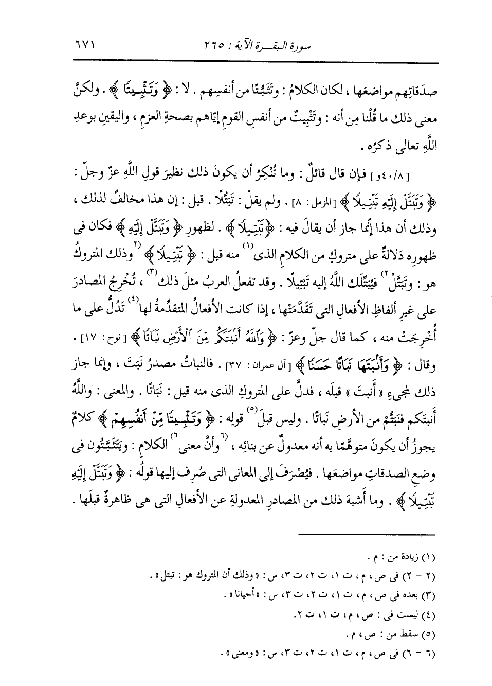 صَدَقَاتِهُمْ مَوَاضِعَهَا لَكَانَ الْكَلَامُ: «وَتَثَبُّتًا مِنْ أَنْفُسِهِمْ» لَا «وَتَثْبِيتًا» وَلَكِنْ مَعْنَى ذَلِكَ مَا قُلْنَا مِنْ أَنَّهُ: وَتَثْبِيتٌ مِنْ أَنْفُسِ الْقَوْمِ إِيَّاهُمْ بِصِحَّةِ الْعَزْمِ وَالْيَقِينِ بِوَعْدِ اللَّهِ تَعَالَى ذِكْرُهُ فَإِنْ قَالَ قَائِلٌ: وَمَا تُنْكِرُ أَنْ يَكُونَ ذَلِكَ نَظِيرَ قَوْلِ اللَّهِ عَزَّ وَجَلَّ: {وَتَبَتَّلْ إِلَيْهِ تَبْتِيلًا} [المزمل: 8] وَلَمْ يَقُلْ: تَبَتُّلًا؟ قِيلَ: إِنَّ هَذَا مُخَالِفُ لِذَلِكَ، وَذَلِكَ أَنَّ هَذَا إِنَّمَا جَازَ أَنْ يُقَالَ فِيهِ: {تُبْتِيلًا} [المزمل: 8] لِظُهُورِ {وَتَبَتَّلْ إِلَيْهِ} [المزمل: 8] ، فَكَانَ فِي ظُهُورِهِ دَلَالَةٌ عَلَى مَتْرُوكٍ مِنَ الْكَلَامِ الَّذِي مِنْهُ قِيلَ: تَبْتِيلًا، وَذَلِكَ أَنَّ الْمَتْرُوكَ هُوَ: «تَبَتَّلْ فَيُبَتِّلَكَ اللَّهُ إِلَيْهِ تَبْتِيلًا» وَقَدْ تَفْعَلُ الْعَرَبُ مِثْلَ ذَلِكَ أَحْيَانًا تُخْرِجُ الْمَصَادِرَ عَلَى غَيْرِ أَلْفَاظِ الْأَفْعَالِ الَّتِي تَقَدَّمَتْهَا إِذَا كَانَتِ الْأَفْعَالُ الْمُتَقَدِّمَةُ تَدُلُّ عَلَى مَا أُخْرِجَتْ مِنْهُ، كَمَا قَالَ جَلَّ وَعَزَّ: {وَاللَّهُ أَنْبَتَكُمْ مِنَ الْأَرْضِ نَبَاتًا} [نوح: 17] وَقَالَ: {وَأَنْبَتَهَا نَبَاتًا حَسَنًا} [آل عمران: 37] وَالنَّبَاتُ: مَصْدَرُ نَبَتَ وَإِنَّمَا جَازَ ذَلِكَ؛ لِمَجِيءِ أَنْبَتَ قَبْلَهُ، فَدَلَّ عَلَى الْمَتْرُوكِ الَّذِي مِنْهُ قِيلَ نَبَاتًا، وَالْمَعْنَى: وَاللَّهُ أَنْبَتَكُمْ فَنَبَتُّمْ مِنَ الْأَرْضِ نَبَاتًا، وَلَيْسَ قَوْلُهُ: {وَتَثْبِيتًا مِنْ أَنْفُسِهِمْ} [البقرة: 265] كَلَامًا يَجُوزُ أَنْ يَكُونَ مُتَوَهَّمًا بِهِ أَنَّهُ مَعْدُولٌ عَنْ بِنَائِهِ، وَمَعْنَى الْكَلَامِ: وَيَتَثَبَّتُونَ فِي وَضْعِ الصَّدَقَاتِ مَوَاضِعَهَا، فَيُصْرَفُ إِلَى الْمَعَانِي الَّتِي صُرِفَ إِلَيْهَا قَوْلُهُ: {وَتَبَتَّلْ إِلَيْهِ تَبْتِيلًا} [المزمل: 8] وَمَا أَشْبَهَ ذَلِكَ مِنَ الْمَصَادِرِ الْمَعْدُولَةِ عَنِ الْأَفْعَالِ الَّتِي هِيَ ظَاهِرَةٌ قَبْلَهَا.