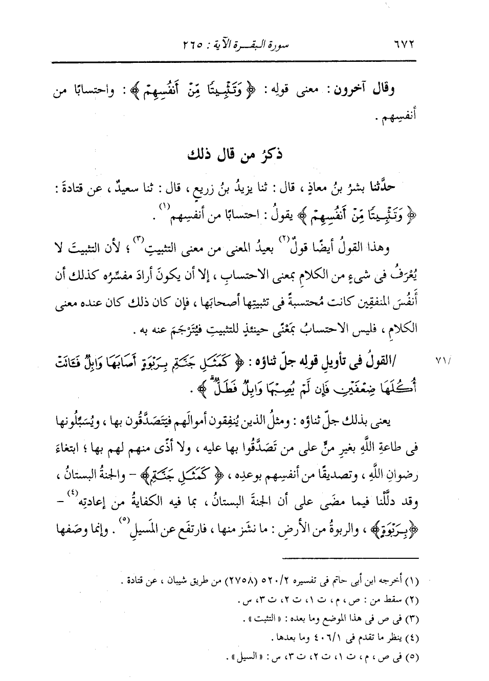 ذِكْرُ مَنْ قَالَ ذَلِكَ: حَدَّثَنَا بِشْرٌ، قَالَ: ثنا يَزِيدُ، قَالَ: ثنا سَعِيدٌ، عَنْ قَتَادَةَ: {§وَتَثْبِيتًا مِنْ أَنْفُسِهِمْ} [البقرة: 265] يَقُولُ: «احْتِسَابًا مِنْ أَنْفُسِهِمْ» وَهَذَا الْقَوْلُ أَيْضًا بَعِيدُ الْمَعْنَى مِنْ مَعْنَى التَّثْبِيتِ، لِأَنَّ التَّثْبِيتَ لَا يُعْرَفُ فِي شَيْءٍ مِنَ الْكَلَامِ بِمَعْنَى الِاحْتِسَابِ، إِلَّا أَنْ يَكُونَ أَرَادَ مُفَسِّرُهُ كَذَلِكَ أَنَّ أَنْفُسَ الْمُنْفِقِينَ كَانَتْ مُحْتَسِبَةً فِي تَثْبِيتِهَا أَصْحَابَهَا، فَإِنْ كَانَ ذَلِكَ كَانَ عِنْدَهُ مَعْنَى الْكَلَامِ، فَلَيْسَ الِاحْتِسَابُ بِمَعْنًى حِينَئِذٍ لِلتَّثْبِيتِ فَيُتَرْجَمُ عَنْهُ بِهِ