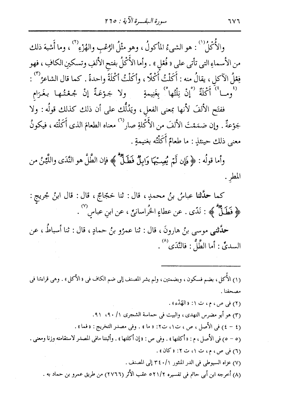 كَمَا: حَدَّثَنَا عَبَّاسُ بْنُ مُحَمَّدٍ، قَالَ: ثنا حَجَّاجٌ، قَالَ: قَالَ ابْنُ جُرَيْجٍ: {§فَطَلٌّ} [البقرة: 265] «نَدَى» عَنْ عَطَاءٍ الْخُرَاسَانِيِّ، عَنِ ابْنِ عَبَّاسٍ