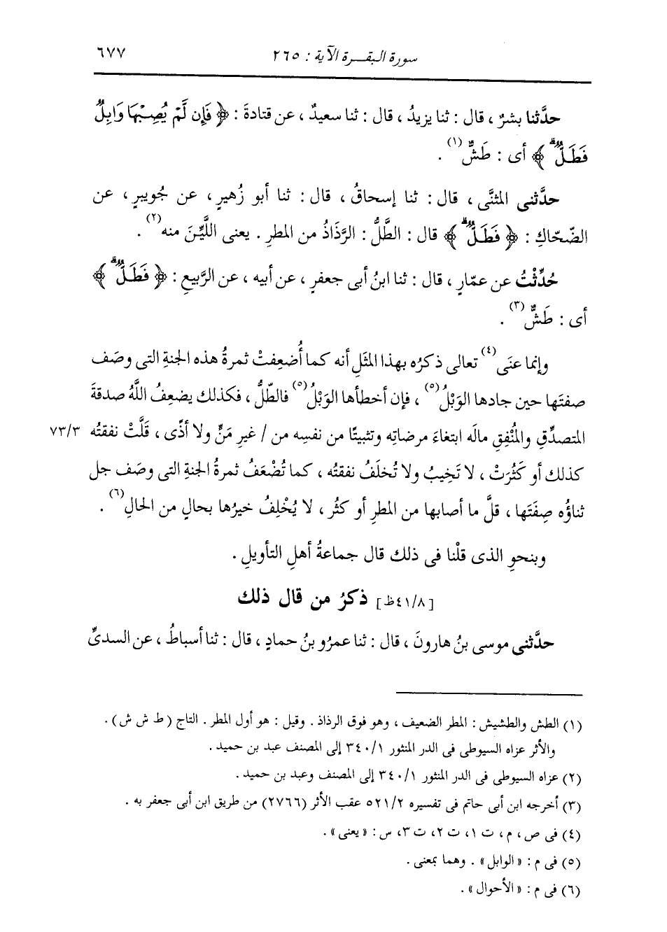 حُدِّثْتُ عَنْ عَمَّارٍ، قَالَ: ثنا ابْنُ أَبِي جَعْفَرٍ، عَنْ أَبِيهِ، عَنِ الرَّبِيعِ: {§فَطَلٌّ} [البقرة: 265] «أَيْ طَشٌّ» وَإِنَّمَا يَعْنِي تَعَالَى ذِكْرُهُ بِهَذَا الْمَثَلِ كَمَا ضُعِّفَتْ ثَمَرَةُ هَذِهِ الْجَنَّةِ الَّتِي وُصِفَتْ صِفَتُهَا حِينَ جَادَ الْوَابِلُ فَإِنْ أَخْطَأَ هَذَا الْوَابِلُ فَالطَّلُّ، كَذَلِكَ يُضَعِّفُ اللَّهُ صَدَقَةَ الْمُتَصَدِّقِ وَالْمُنْفِقِ مَالِهِ ابْتِغَاءَ مَرْضَاتِهِ وَتَثْبِيتًا مِنْ نَفْسِهِ مِنْ غَيْرِ مَنٍّ وَلَا أَذًى، قَلَّتْ نَفَقَتُهُ أَوْ كَثُرَتْ لَا تَخِيبُ وَلَا تُخَلَّفُ نَفَقَتُهُ، كَمَا تُضَعَّفُ الْجَنَّةُ الَّتِي وَصَفَ جَلَّ ثناؤُهُ صِفَتَهَا قَلَّ مَا أَصَابَهَا مِنَ الْمَطَرِ أَوْ كَثُرَ لَا يُخَلَّفُ خَيْرُهَا بِحَالٍ مِنَ الْأَحْوَالِ، وَبِنَحْوِ الَّذِي قُلْنَا فِي ذَلِكَ قَالَ جَمَاعَةُ أَهْلِ التَّأْوِيلِ