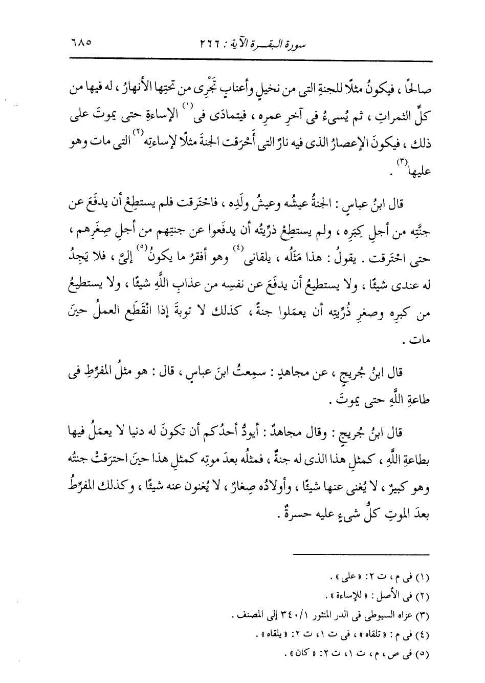 صَالِحًا، فَيَكُونُ مَثَلًا لِلْجَنَّةِ الَّتِي مِنْ نَخِيلِ وَأَعْنَابٍ تَجْرِي مِنْ تَحْتِهَا الْأَنْهَارُ، لَهُ فِيهَا مِنْ كُلِّ الثَّمَرَاتِ، ثُمَّ يُسِيءُ فِي آخِرِ عُمْرِهِ، فَيَتَمَادَى عَلَى الْإِسَاءَةِ حَتَّى يَمُوتَ عَلَى ذَلِكَ، فَيَكُونُ الْإِعْصَارُ الَّذِي فِيهِ النَّارُ الَّتِي أَحْرَقَتِ الْجَنَّةَ، مَثَلًا لِإِسَاءَتِهِ الَّتِي مَاتَ وَهُوَ عَلَيْهَا» قَالَ ابْنُ عَبَّاسٍ: " الْجَنَّةُ عَيْشُهُ وَعَيْشُ وَلَدِهِ فَاحْتَرَقَتْ، فَلَمْ يَسْتَطِعْ أَنْ يَدْفَعَ عَنْ جَنَّتِهِ مِنْ أَجْلِ كِبَرِهِ، وَلَمْ يَسْتَطِعْ ذُرِّيَّتُهُ أَنْ يَدْفَعُوا عَنْ جَنَّتِهِمْ مِنْ أَجْلِ صِغَرِهِمْ حَتَّى احْتَرَقَتْ، يَقُولُ: هَذَا مَثَلُهُ تَلَقَّاهُ وَهُوَ أَفْقَرُ مَا كَانَ إِلَيَّ، فَلَا يَجِدُ لَهُ عِنْدِي شَيْئًا، وَلَا يَسْتَطِيعُ أَنْ يَدْفَعَ عَنْ نَفْسِهِ مِنْ عَذَابِ اللَّهِ شَيْئًا، وَلَا يَسْتَطِيعُ مِنْ كِبَرِهِ وَصِغَرِ أَوْلَادِهِ أَنْ يَعْمَلُوا جَنَّةً، كَذَلِكَ لَا تَوْبَةَ إِذَا انْقَطَعَ الْعَمَلُ حِينَ مَاتَ "، قَالَ ابْنُ جُرَيْجٍ، عَنْ مُجَاهِدٍ: سَمِعْتُ ابْنَ عَبَّاسٍ قَالَ: «هُوَ مَثَلُ الْمُفَرِّطِ فِي طَاعَةِ اللَّهِ حَتَّى يَمُوتُ»