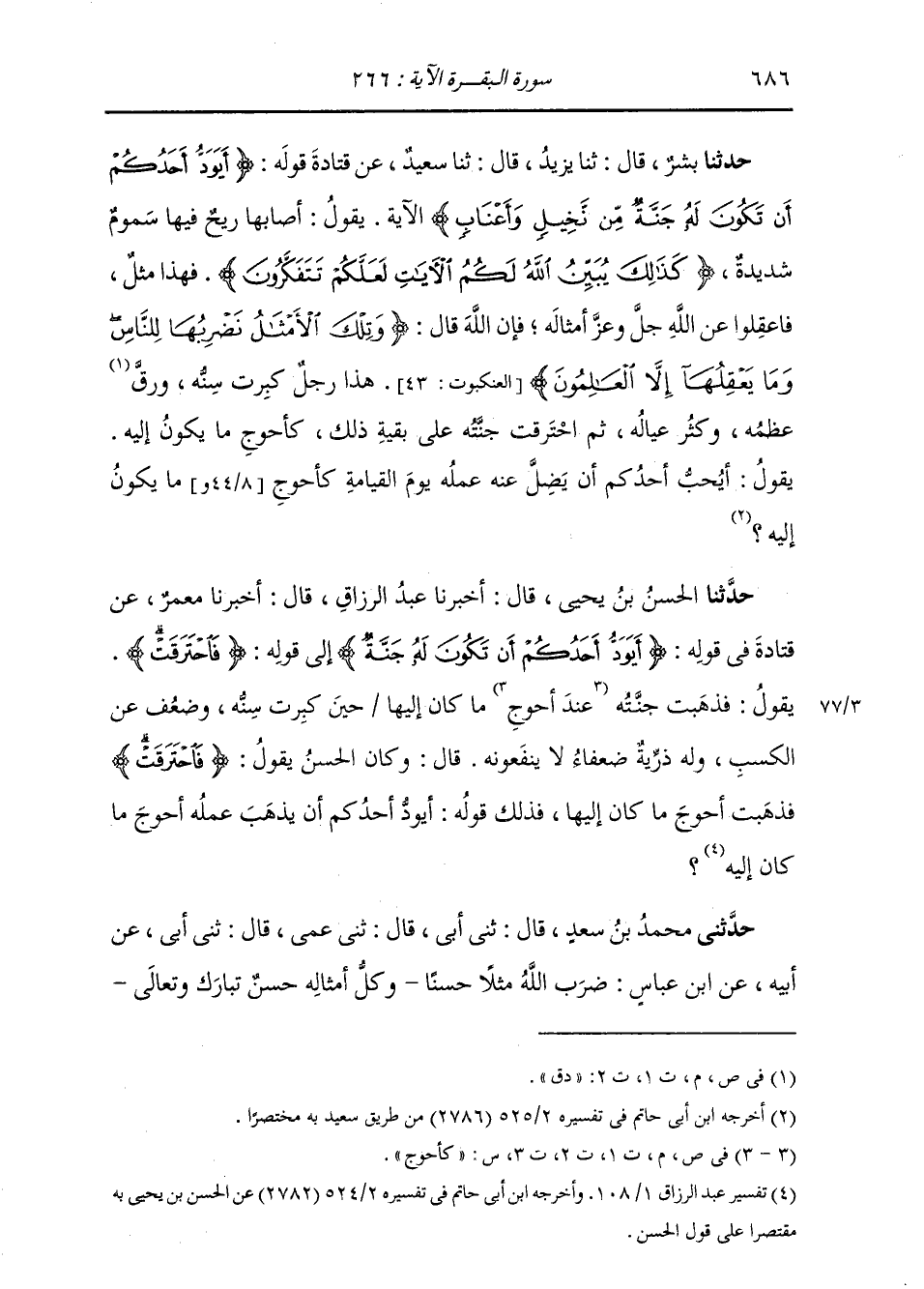 حَدَّثَنَا بِشْرٌ، قَالَ: ثنا يَزِيدُ، قَالَ: ثنا سَعِيدٌ، عَنْ قَتَادَةَ، قَوْلُهُ: {§أَيَوَدُّ أَحَدُكُمْ أَنْ تَكُونَ لَهُ جَنَّةٌ مِنْ نَخِيلِ وَأَعْنَابٍ تَجْرِي مِنْ تَحْتِهَا الْأَنْهَارُ} [البقرة: 266] ، الْآيَةَ، يَقُولُ: " أَصَابَهَا رِيحٌ فِيهَا سُمُومٌ شَدِيدَةٌ، كَذَلِكَ يُبَيِّنُ اللَّهُ لَكُمُ الْآيَاتِ لَعَلَّكُمْ تَتَفَكَّرُونَ، فَهَذَا مَثَلٌ، فَاعْقِلُوا عَنِ اللَّهِ جَلَّ وَعَزَّ أَمْثَالَهُ، فَإِنَّهُ قَالَ: {وَتِلْكَ الْأَمْثَالُ نَضْرِبُهَا لِلنَّاسِ وَمَا يَعْقِلُهَا إِلَّا الْعَالِمُونَ} [العنكبوت: 43] هَذَا رَجُلٌ كَبِرَتْ سِنُّهُ وَدَقَّ عَظْمُهُ وَكَثُرَ عِيَالُهُ، ثُمَّ احْتَرَقَتْ جَنَّتُهُ عَلَى بَقِيَّةِ ذَلِكَ كَأَحْوَجِ مَا يَكُونُ إِلَيْهِ، يَقُولُ: أَيُحِبُّ أَحَدُكُمْ أَنْ يَضِلَّ عَنْهُ عَمَلُهُ يَوْمَ الْقِيَامَةِ كَأَحْوَجِ مَا يَكُونُ إِلَيْهِ؟ "