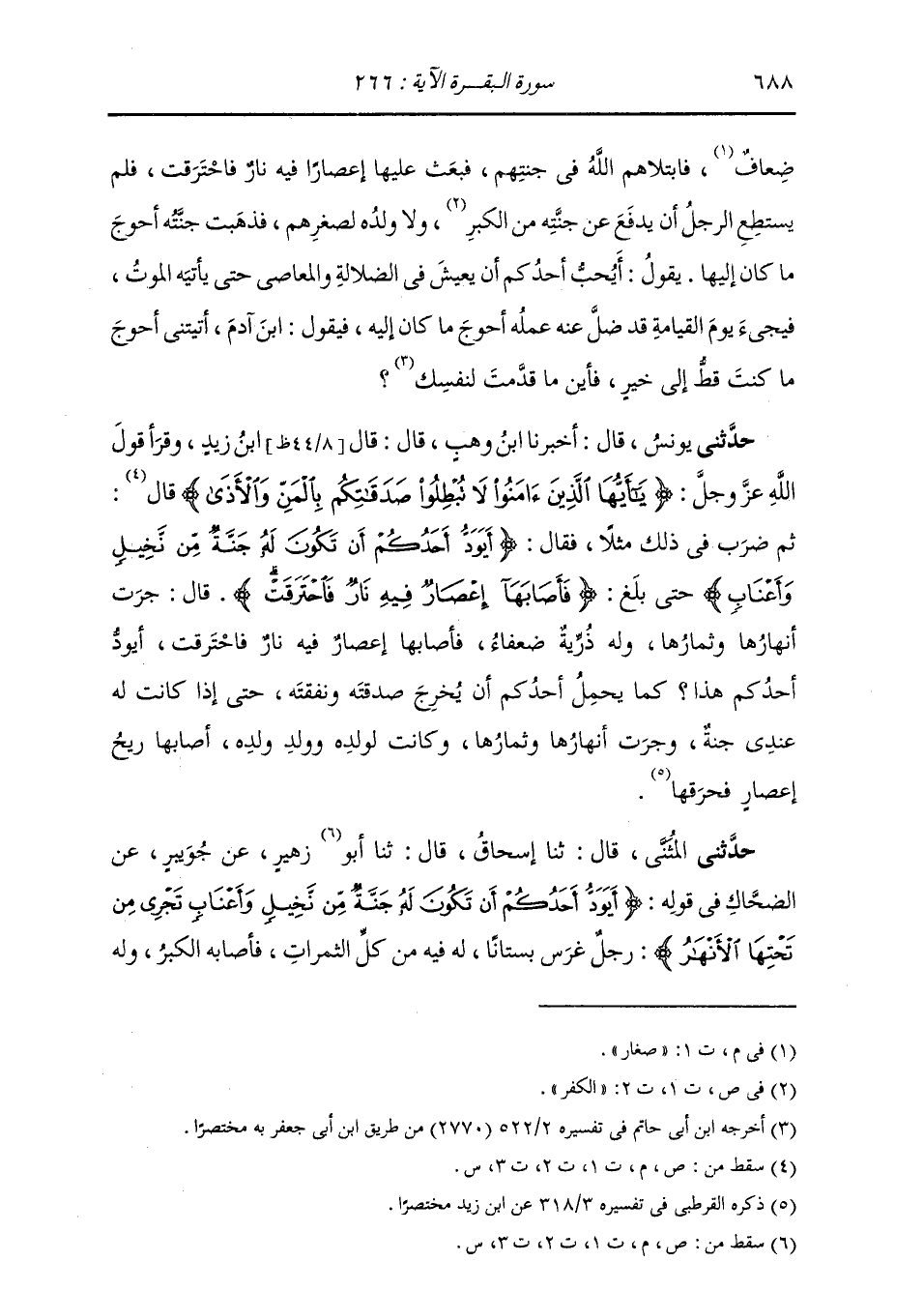 حَدَّثَنِي يُونُسُ، قَالَ: أَخْبَرَنَا ابْنُ وَهْبٍ، قَالَ: قَالَ ابْنُ زَيْدٍ: وَقَرَأَ قَوْلَ اللَّهِ عَزَّ وَجَلَّ {يَا أَيُّهَا الَّذِينَ آمَنُوا لَا تُبْطِلُوا صَدَقَاتِكُمْ بِالْمَنِّ وَالْأَذَى} [البقرة: 264] ثُمَّ ضَرَبَ ذَلِكَ مَثَلًا، فَقَالَ: {§أَيَوَدُّ أَحَدُكُمْ أَنْ تَكُونَ لَهُ جَنَّةٌ مِنْ نَخِيلِ وَأَعْنَابٍ} [البقرة: 266] حَتَّى بَلَغَ {فَأَصَابَهَا إِعْصَارٌ فِيهِ نَارٌ فَاحْتَرَقَتْ} [البقرة: 266] قَالَ: «جَرَتْ أَنْهَارُهَا وَثِمَارُهَا، وَلَهُ ذُرِّيَّةٌ ضُعَفَاءُ، فَأَصَابَهَا إِعْصَارٌ فِيهِ نَارٌ فَاحْتَرَقَتْ، أَيَوَدُّ أَحَدُكُمْ هَذَا؟ فَمَا يَحْمِلُ أَحَدُكُمْ أَنْ يُخْرِجَ مِنْ صَدَقَتِهِ وَنَفَقَتِهِ حَتَّى إِذَا كَانَ لَهُ عِنْدِي جَنَّةٌ وَجَرَتْ أَنْهَارُهَا وَثِمَارُهَا، وَكَانَتْ لِوَلَدِهِ وَوَلَدِ وَلَدِهِ أَصَابَهَا رِيحُ إِعْصَارٍ فَحَرَّقَهَا»