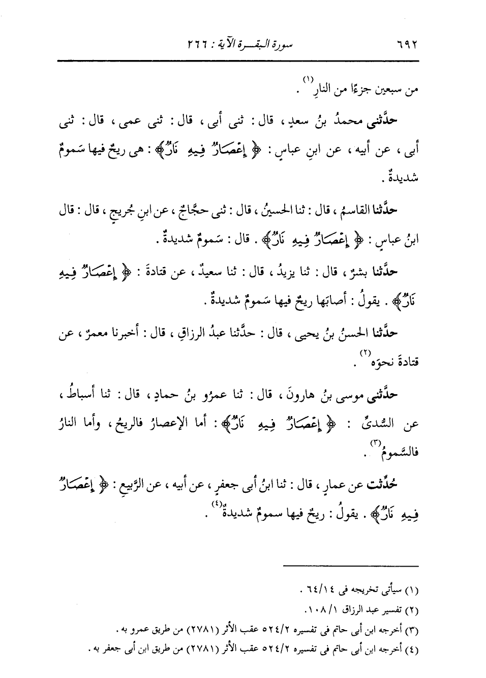 حَدَّثَنَا بِشْرٌ، قَالَ: ثنا يَزِيدُ، قَالَ: ثنا سَعِيدٌ، عَنْ قَتَادَةَ: {§إِعْصَارٌ فِيهِ نَارٌ} [البقرة: 266] يَقُولُ: «أَصَابَهَا رِيحٌ فِيهَا سُمُومٌ شَدِيدَةٌ» حَدَّثَنَا الْحَسَنُ بْنُ يَحْيَى، قَالَ: أَخْبَرَنَا عَبْدُ الرَّزَّاقِ، قَالَ: أَخْبَرَنَا مَعْمَرٌ، عَنْ قَتَادَةَ، نَحْوَهُ