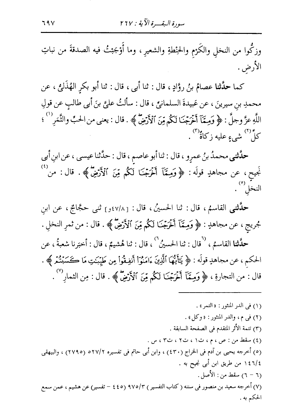 حَدَّثَنَا الْقَاسِمُ، قَالَ: ثنا الْحُسَيْنُ، قَالَ: ثنا هُشَيْمٌ، قَالَ: ثنا شُعْبَةُ، عَنِ الْحَكَمِ، عَنْ مُجَاهِدٍ، قَوْلُهُ: {يَا أَيُّهَا الَّذِينَ آمَنُوا §أَنْفِقُوا مِنْ طَيِّبَاتِ مَا كَسَبْتُمْ} [البقرة: 267] قَالَ: «مِنَ التِّجَارَةِ» ، {وَمِمَّا أَخْرَجْنَا لَكُمْ مِنَ الْأَرْضِ} [البقرة: 267] «مِنَ الثِّمَارِ»