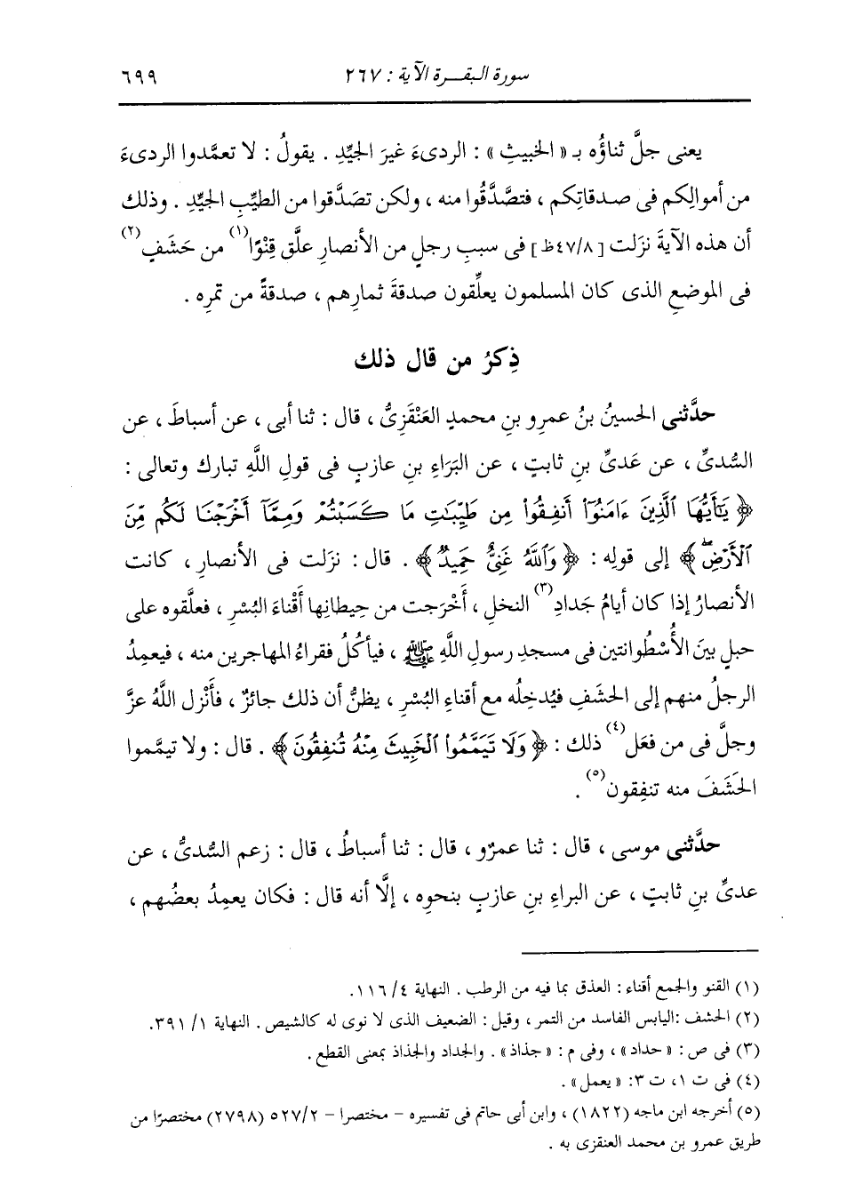ذِكْرُ مَنْ قَالَ ذَلِكَ حَدَّثَنِي الْحُسَيْنُ بْنُ عَمْرِو بْنِ مُحَمَّدٍ الْعَنْقَزِيُّ، قَالَ: ثنا أَبِي، عَنْ أَسْبَاطٍ، عَنِ السُّدِّيِّ، عَنْ عَدِيِّ بْنِ ثَابِتٍ، عَنِ الْبَرَاءِ بْنِ عَازِبٍ فِي قَوْلِ اللَّهِ عَزَّ وَجَلَّ {§يَا أَيُّهَا الَّذِينَ آمَنُوا أَنْفِقُوا مِنْ طَيِّبَاتِ مَا كَسَبْتُمْ وَمِمَّا أَخْرَجْنَا لَكُمْ مِنَ الْأَرْضِ} [البقرة: 267] إِلَى قَوْلِهِ: {وَاللَّهُ غَنِيُّ حُمَيْدٌ} [التغابن: 6] قَالَ: " نَزَلَتْ فِي الْأَنْصَارِ، كَانَتِ الْأَنْصَارُ إِذَا كَانَ أَيَّامُ جُذَاذِ النَّخْلِ أَخْرَجَتْ مِنْ حِيطَانِهَا أَقْنَاءَ الْبُسْرِ، فَعَلَّقُوهُ عَلَى حَبْلٍ بَيْنَ الْأُسْطُوَانَتَيْنِ فِي مَسْجِدِ رَسُولِ اللَّهِ صَلَّى اللهُ عَلَيْهِ وَسَلَّمَ، فَيَأْكُلُ فُقَرَاءُ الْمُهَاجِرِينَ مِنْهُ، فَيَعْمِدُ الرَّجُلُ مِنْهُمْ إِلَى الْحَشَفِ فَيُدْخِلُهُ مَعَ أَقْنَاءِ الْبُسْرِ يَظُنُّ أَنَّ ذَلِكَ جَائِزٌ، فَأَنْزَلَ اللَّهُ عَزَّ وَجَلَّ فِيمَنْ فَعَلَ ذَلِكَ: {وَلَا تَيَمَّمُوا الْخَبِيثَ مِنْهُ تُنْفِقُونَ} [البقرة: 267] قَالَ «لَا تَيَمَّمُوا الْحَشَفَ مِنْهُ تُنْفِقُونَ» حَدَّثَنِي مُوسَى، قَالَ: ثنا عَمْرٌو، قَالَ: ثنا أَسْبَاطٌ، زَعَمَ السُّدِّيُّ، عَنْ عَدِيِّ بْنِ ثَابِتٍ، عَنِ الْبَرَاءِ بْنِ عَازِبٍ بِنَحْوِهِ، إِلَّا أَنَّهُ قَالَ: " فَكَانَ يَعْمِدُ بَعْضُهُمْ، -[700]- فَيُدْخِلُ قِنْوَ الْحَشَفِ وَيَظُنُّ أَنَّهُ جَائِزٌ عَنْهُ فِي كَثْرَةِ مَا يُوضَعُ مِنَ الْأَقْنَاءِ، فَنَزَلَ فِيمَنْ فَعَلَ ذَلِكَ: {وَلَا تَيَمَّمُوا الْخَبِيثَ مِنْهُ تُنْفِقُونَ} [البقرة: 267] الْقِنْوَ الَّذِي قَدْ حَشَفَ، وَلَوْ أُهْدِيَ إِلَيْكُمْ مَا قَبِلْتُمُوهُ "
