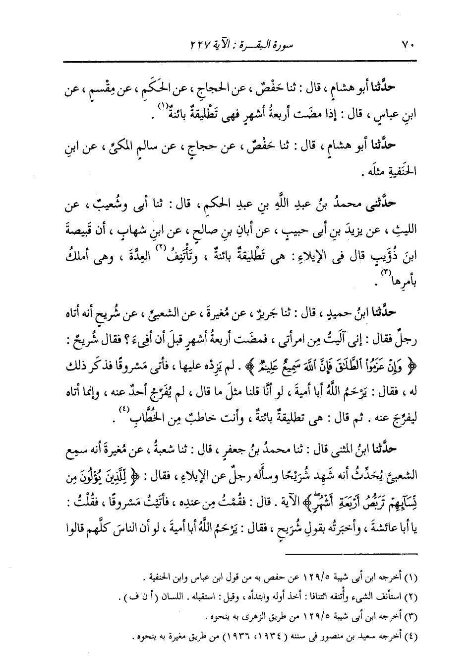 حَدَّثَنَا أَبُو هِشَامٍ، قَالَ: ثنا حَفْصٌ، عَنِ الْحَجَّاجِ، عَنِ الْحَكَمِ، عَنْ مِقْسَمٍ، عَنِ ابْنِ عَبَّاسٍ، قَالَ: «§إِذَا مَضَتْ أَرْبَعَةُ أَشْهُرٍ فَهِيَ تَطْلِيقَةٌ بَائِنَةٌ» حَدَّثَنَا أَبُو هِشَامٍ، قَالَ: ثنا حَفْصٌ، عَنْ حَجَّاجٍ، عَنْ سَالِمٍ الْمَكِّيِّ، عَنِ ابْنِ الْحَنَفِيَّةِ، مِثْلَهُ