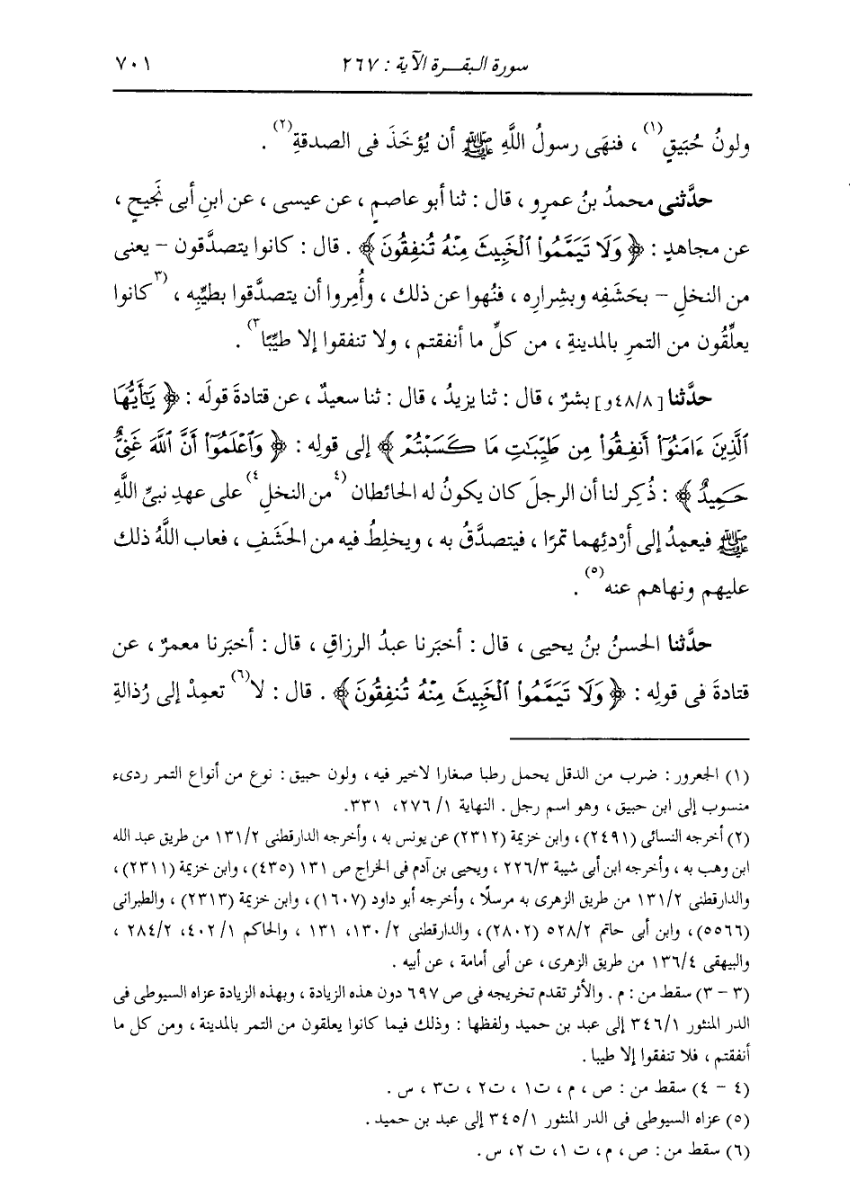 حَدَّثَنِي مُحَمَّدُ بْنُ عَمْرٍو، قَالَ: ثنا أَبُو عَاصِمٍ، عَنْ عِيسَى، عَنِ ابْنِ أَبِي نَجِيحٍ، عَنْ مُجَاهِدٍ: {§وَلَا تَيَمَّمُوا الْخَبِيثَ مِنْهُ تُنْفِقُونَ} [البقرة: 267] قَالَ: «كَانُوا يَتَصَدَّقُونَ، يَعْنِي مِنَ النَّخْلِ بِحَشَفِهِ وَشِرَارِهِ، فَنُهُوا عَنْ ذَلِكَ وَأُمِرُوا أَنْ يَتَصَدَّقُوا بِطَيِّبِهِ»