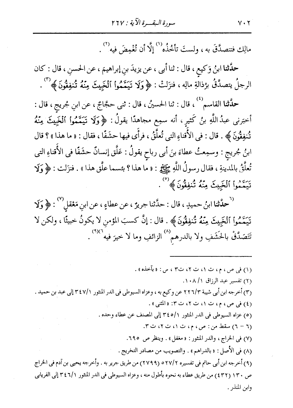 حَدَّثَنَا الْمُثَنَّى، قَالَ: ثنا الْحُسَيْنُ، قَالَ: ثني حَجَّاجٌ، عَنِ ابْنِ جُرَيْجٍ، قَالَ: أَخْبَرَنَا عَبْدُ اللَّهِ بْنُ كَثِيرٍ، أَنَّهُ سَمِعَ مُجَاهِدًا، يَقُولُ: {§وَلَا تَيَمَّمُوا الْخَبِيثَ مِنْهُ تُنْفِقُونَ} [البقرة: 267] قَالَ: " فِي الْأَقْنَاءِ الَّتِي تُعَلَّقُ، فَرَأَى فِيهَا حَشَفًا، فَقَالَ: «مَا هَذَا؟»