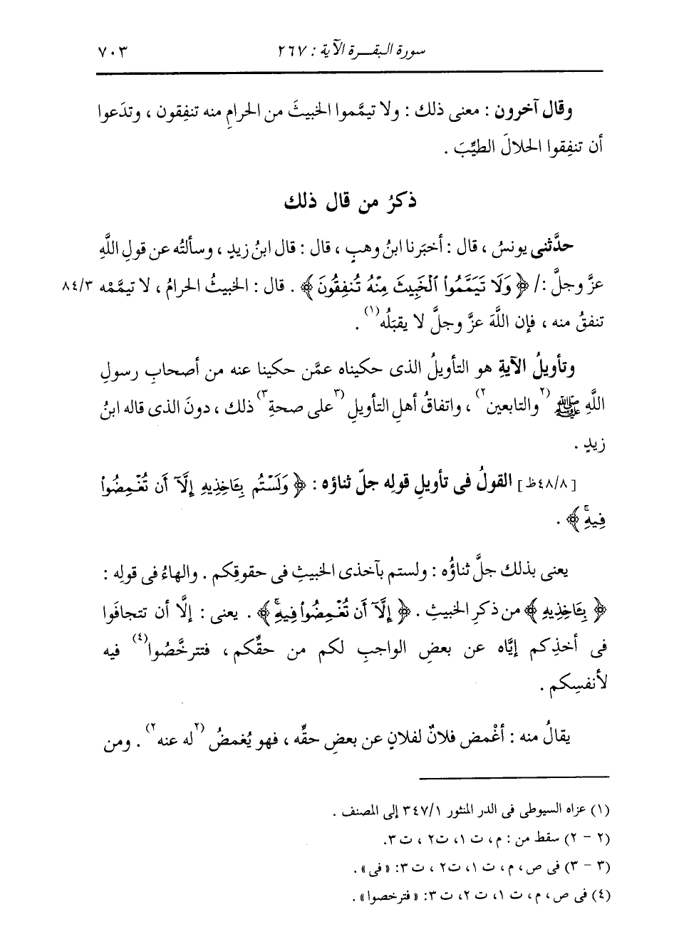 ذِكْرُ مَنْ قَالَ ذَلِكَ: حَدَّثَنِي يُونُسُ، قَالَ: أَخْبَرَنَا ابْنُ وَهْبٍ، قَالَ: قَالَ ابْنُ زَيْدٍ: وَسَأَلْتُهُ عَنْ قَوْلِ اللَّهِ عَزَّ وَجَلَّ: {§وَلَا تَيَمَّمُوا الْخَبِيثَ مِنْهُ تُنْفِقُونَ} [البقرة: 267] قَالَ: " الْخَبِيثُ: الْحَرَامُ، لَا تَيَمَّمْهُ تُنْفِقُ مِنْهُ فَإِنَّ اللَّهَ عَزَّ وَجَلَّ لَا يَقْبَلُهُ " وَتَأْوِيلُ الْآيَةِ: هُوَ التَّأْوِيلُ الَّذِي حَكَيْنَاهُ عَمَّنْ حَكَيْنَا مِنْ أَصْحَابِ رَسُولِ اللَّهِ صَلَّى اللهُ عَلَيْهِ وَسَلَّمَ، وَاتِّفَاقُ أَهْلِ التَّأْوِيلِ فِي ذَلِكَ دُونَ الَّذِي قَالَهُ ابْنُ زَيْدٍ