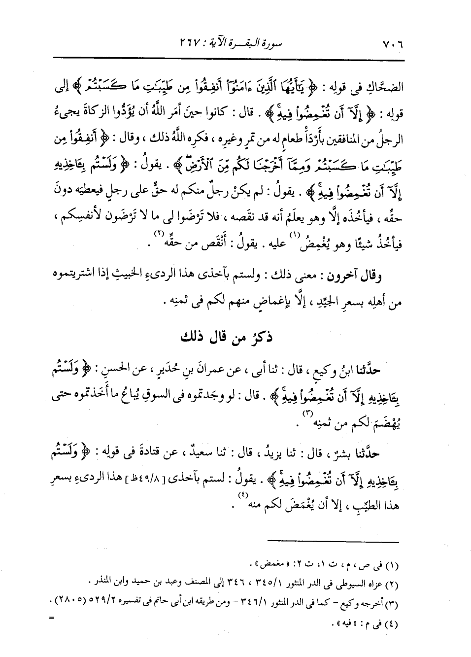 الضَّحَّاكِ فِي قَوْلِهِ: {يَا أَيُّهَا الَّذِينَ آمَنُوا §أَنْفِقُوا مِنْ طَيِّبَاتِ مَا كَسَبْتُمْ} [البقرة: 267] إِلَى قَوْلِهِ: {إِلَّا أَنْ تُغْمِضُوا فِيهِ} [البقرة: 267] قَالَ: «كَانُوا حِينَ أَمَرَ اللَّهُ أَنْ يُؤَدُّوا الزَّكَاةَ يَجِيءُ الرَّجُلُ مِنَ الْمُنَافِقِينَ بَأَرْدَأِ طَعَامٍ لَهُ مِنْ تَمْرٍ وَغَيْرِهِ، فَكَرِهَ اللَّهُ ذَلِكَ» ، وَقَالَ: {أَنْفِقُوا مِنْ طَيِّبَاتِ مَا كَسَبْتُمْ وَمِمَّا أَخْرَجْنَا لَكُمْ مِنَ الْأَرْضِ} [البقرة: 267] يَقُولُ: {لَسْتُمْ بِآخِذِيهِ إِلَّا أَنْ تُغْمِضُوا فِيهِ} [البقرة: 267] ، يَقُولُ: «لَمْ يَكُنْ رَجُلٌ مِنْكُمْ لَهُ حَقٌّ عَلَى رَجُلٍ فَيُعْطِيهِ دُونَ حَقَّهِ فَيَأْخُذُهُ إِلَّا وَهُوَ يَعْلَمُ أَنَّهُ قَدْ نَقَصَهُ، فَلَا تَرْضَوْا لِي مَا لَا تَرْضَوْنَ لِأَنْفُسِكُمْ، فَيَأْخُذُ شَيْئًا وَهُوَ مُغْمِضٌ عَلَيْهِ أَنْقَصَ مِنْ حَقِّهِ» وَقَالَ آخَرُونَ: مَعْنَى ذَلِكَ: وَلَسْتُمْ بِآخِذِي هَذَا الرَّدِيءِ الْخَبِيثِ إِذَا اشْتَرَيتُمُوهُ مِنْ أَهْلِهِ بِسِعْرِ الْجَيِّدِ إِلَّا بِإِغْمَاضٍ مِنْهُمْ لَكُمْ فِي ثَمَنِهِ