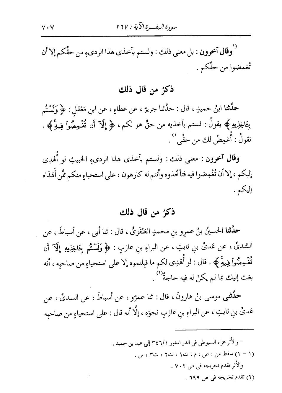 ذِكْرُ مَنْ قَالَ ذَلِكَ: حَدَّثَنِي الْحُسَيْنُ بْنُ عَمْرِو بْنِ مُحَمَّدٍ الْعَنْقَزِيُّ، قَالَ: ثنا أَبِي، عَنْ أَسْبَاطٍ، عَنِ السُّدِّيِّ، عَنْ عَدِيِّ بْنِ ثَابِتٍ، عَنِ الْبَرَاءِ بْنِ عَازِبٍ: {§وَلَسْتُمْ بِآخِذِيهِ إِلَّا أَنْ تُغْمِضُوا فِيهِ} [البقرة: 267] قَالَ: «لَوْ أُهْدِيَ لَكُمْ مَا قَبِلْتُمُوهُ إِلَّا عَلَى اسْتِحْيَاءٍ مِنْ صَاحِبِهِ أَنَّهُ بَعَثَ إِلَيْكَ بِمَا لَمْ يَكُنْ لَهُ فِيهِ حَاجَةٌ» حَدَّثَنِي مُوسَى، قَالَ: ثنا عَمْرٌو، قَالَ: ثنا أَسْبَاطٌ، قَالَ: زَعَمَ السُّدِّيُّ، عَنْ عَدِيِّ بْنِ ثَابِتٍ، عَنِ الْبَرَاءِ نَحْوَهُ، إِلَّا أَنَّهُ قَالَ: إِلَّا عَلَى اسْتِحْيَاءٍ مِنْ صَاحِبِهِ -[708]- وَغْيَظٍ أَنَّهُ بَعَثَ إِلَيْكَ بِمَا لَمْ يَكُنْ لَهُ فِيهِ حَاجَةٌ. وَقَالَ آخَرُونَ: مَعْنَى ذَلِكَ: وَلَسْتُمْ بِآخِذِي هَذَا الرَّدِيءِ مِنْ حَقِّكُمْ إِلَّا أَنْ تُغْمِضُوا مِنْ حَقِّكُمْ
