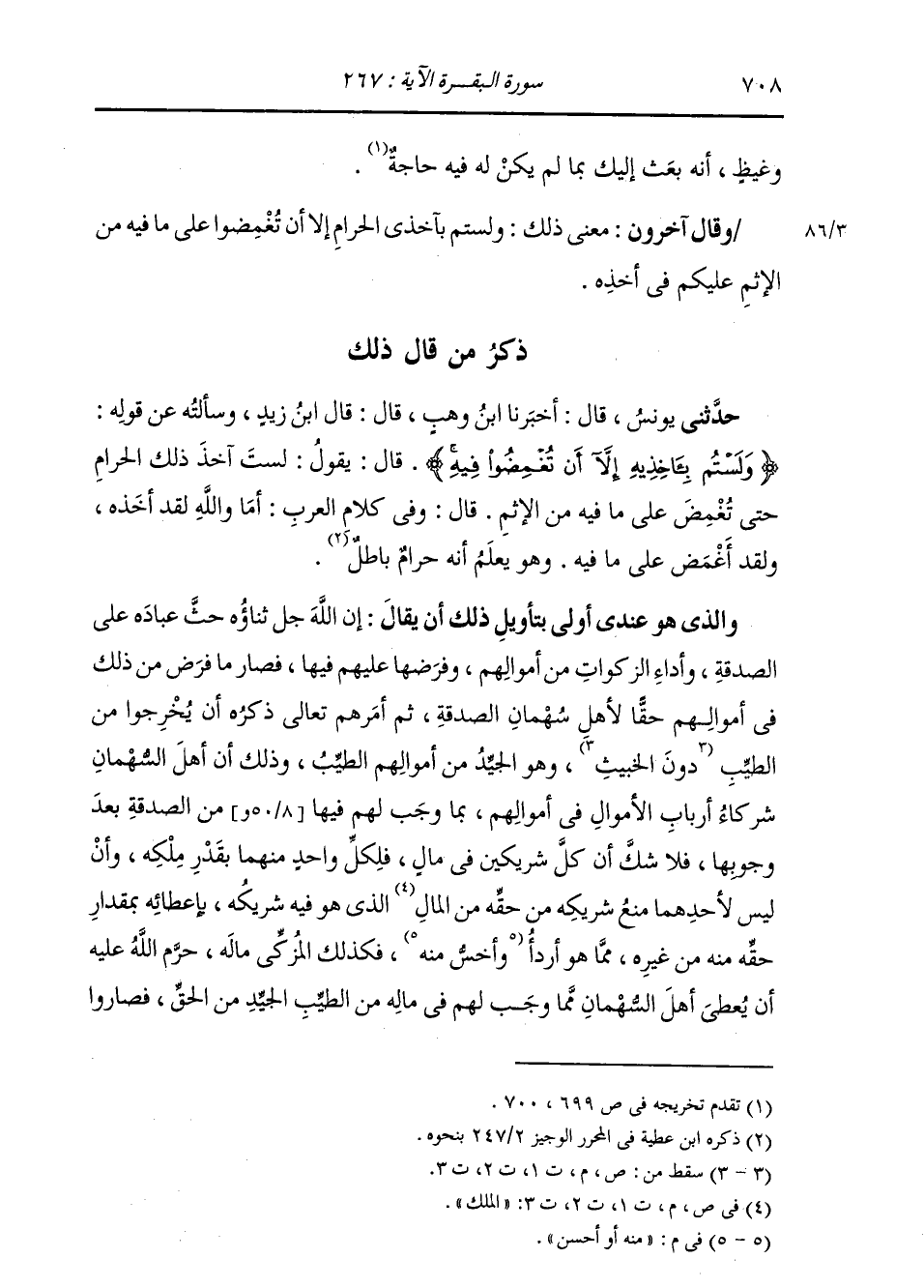 ذِكْرُ مَنْ قَالَ ذَلِكَ: حَدَّثَنِي يُونُسُ، قَالَ: ثنا ابْنُ وَهْبٍ، قَالَ: قَالَ ابْنُ زَيْدٍ: وَسَأَلْتُهُ عَنْ قَوْلِهِ: {§وَلَسْتُمْ بِآخِذِيهِ إِلَّا أَنْ تُغْمِضُوا فِيهِ} [البقرة: 267] قَالَ: يَقُولُ: «لَسْتَ آخِذًا ذَلِكَ الْحَرَامَ حَتَّى تُغْمِضَ عَلَى مَا فِيهِ مِنَ الْإِثْمِ» قَالَ: " وَفِي كَلَامِ الْعَرَبِ: أَمَا وَاللَّهِ لَقَدْ أَخَذَهُ وَلَقَدْ أَغْمَضَ عَلَى مَا فِيهِ وَهُوَ يَعْلَمُ أَنَّهُ حَرَامٌ بَاطِلٌ وَالَّذِي هُوَ أَوْلَى بِتَأْوِيلِ ذَلِكَ عِنْدَنَا أَنْ يُقَالَ: إِنَّ اللَّهَ عَزَّ وَجَلَّ حَثَّ عِبَادَهُ عَلَى الصَّدَقَةِ وَأَدَاءِ الزَّكَاةِ مِنْ أَمْوَالِهِمْ وَفَرَضَهَا عَلَيْهِمْ فِيهَا، فَصَارَ مَا فَرَضَ مِنْ ذَلِكَ فِي أَمْوَالِهِمْ حَقًّا لِأَهْلِ سُهْمَانِ الصَّدَقَةِ، ثُمَّ أَمَرَهُمْ تَعَالَى ذِكْرُهُ أَنْ يُخْرِجُوا مِنَ الطَّيِّبِ، وَهُوَ الْجَيِّدُ مِنْ أَمْوَالِهِمُ الطَّيِّبَ، وَذَلِكَ أَنَّ أَهْلَ السُّهْمَانِ شُرَكَاءُ أَرْبَابِ الْأَمْوَالِ فِي أَمْوَالِهِمْ بِمَا وَجَبَ لَهُمْ فِيهَا مِنَ الصَّدَقَةِ بَعْدَ وجُوبِهَا، فَلَا شَكَّ أَنَّ كُلَّ شَرِيكَيْنِ فِي مَالٍ فَلِكُلِّ وَاحِدٍ مِنْهُمَا بِقَدْرِ مِلْكِهِ، وَلَيْسَ لِأَحَدِهِمَا مَنْعُ شَرِيكِهِ مِنْ حَقِّهِ مِنَ الْمِلْكِ الَّذِي هُوَ فِيهِ شَرِيكُهُ بِإِعْطَائِهِ بِمِقْدَارِ حَقِّهِ مِنْهُ مِنْ غَيْرِهِ، مِمَّا هُوَ أَرْدَأُ مِنْهُ أَوْ أَخَسُّ، فَكَذَلِكَ الْمُزَكِّي مَالَهُ حَرَّمَ اللَّهُ عَلَيْهِ أَنْ يُعْطِيَ أَهْلَ السُّهْمَانِ مِمَّا وَجَبَ لَهُمْ فِي مَالِهِ مِنَ الطَّيِّبِ الْجَيِّدِ مِنَ الْحَقِّ، فَصَارُوا