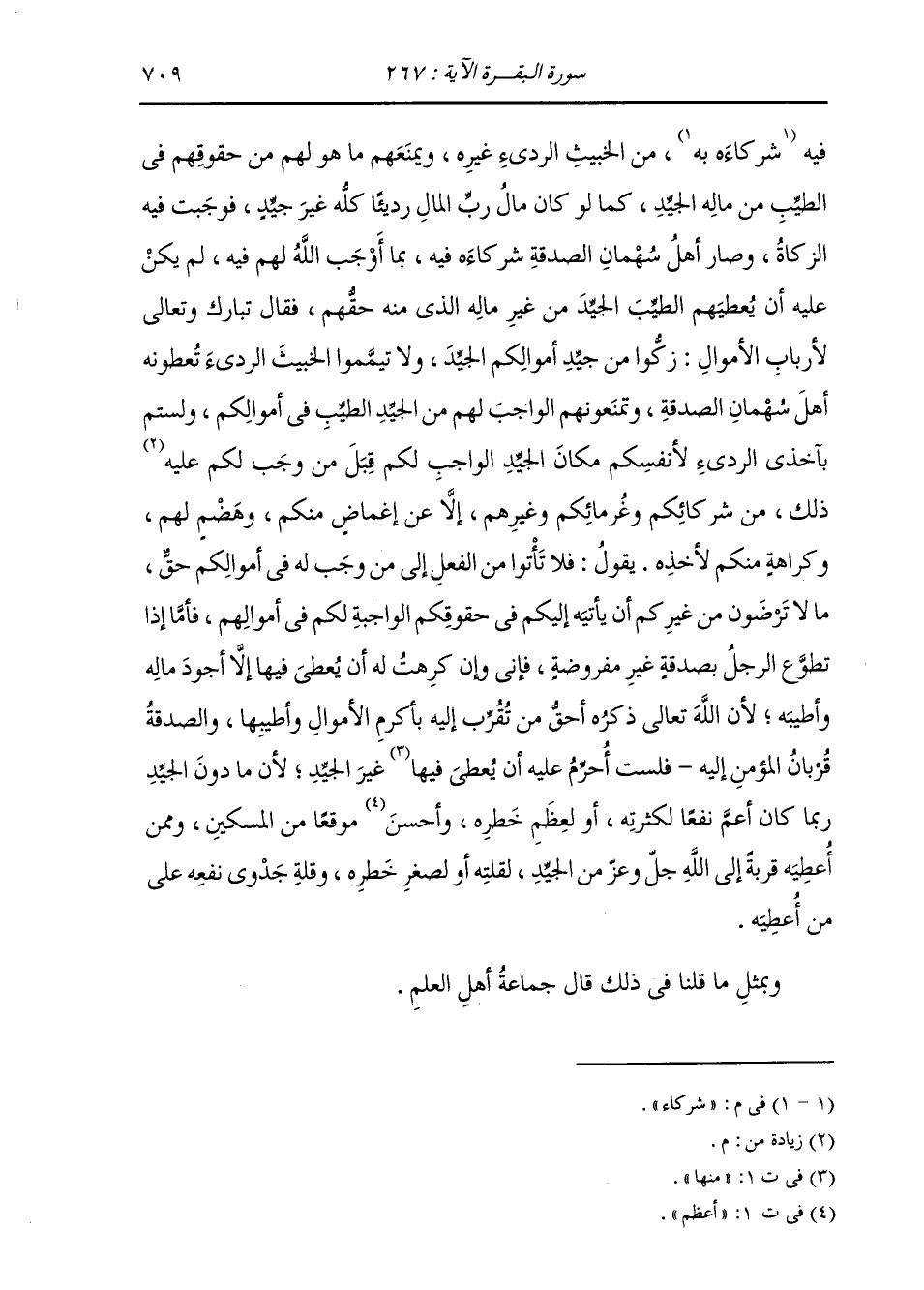 فِيهِ شُرَكَاءَ مِنَ الْخَبِيثِ الرَّدِيءِ غَيْرِهِ، وَيَمْنَعُهُمْ مَا هُوَ لَهُمْ مِنْ حُقُوقِهِمْ فِي الطَّيِّبِ مِنْ مَالِهِ الْجَيِّدِ، كَمَا لَوْ كَانَ مَالُ رَبِّ الْمَالِ رَدِيئًا كُلُّهُ غَيْرَ جَيِّدٍ، فَوَجَبَتْ فِيهِ الزَّكَاةُ وَصَارَ أَهْلُ سُهْمَانِ الصَّدَقَةِ فِيهِ شُرَكَاءَ بِمَا أَوْجَبَ اللَّهُ لَهُمْ فِيهِ لَمْ يَكُنْ عَلَيْهِ أَنْ يُعْطِيَهُمُ الطَّيِّبَ الْجَيِّدَ مِنْ غَيْرِ مَالِهِ الَّذِي مِنْهُ حَقُّهُمْ، فَقَالَ تَبَارَكَ وَتَعَالَى لِأَرْبَابِ الْأَمْوَالِ: زَكُّوا مِنْ جَيِّدِ أَمْوَالِكُمُ الْجَيِّدَ، وَلَا تَيَمَّمُوا الْخَبِيثَ الرَّدِيءَ تُعْطُونَهُ أَهْلَ سُهْمَانِ الصَّدَقَةِ، وَتَمْنَعُونَهُمُ الْوَاجِبَ لَهُمْ مِنَ الْجَيِّدِ الطَّيِّبِ فِي أَمْوَالِكُمْ، وَلَسْتُمْ بِآخِذِي الرَّدِيءِ لِأَنْفُسِكُمْ مَكَانَ الْجَيِّدِ الْوَاجِبِ لَكُمْ قِبَلَ مَنْ وَجَبَ لَكُمْ عَلَيْهِ ذَلِكَ مِنْ شُرَكَائِكُمْ وَغُرَمَائِكُمْ وَغَيْرِهِمْ إِلَّا عَنْ إِغْمَاضٍ مِنْكُمْ وَهَضْمٍ لَهُمْ وَكَرَاهَةٍ مِنْكُمْ لِأَخْذِهِ، يَقُولُ: وَلَا تَأْتُوا مِنَ الْفِعْلِ إِلَى مَنْ وَجَبَ لَهُ فِي أَمْوَالِكُمْ حَقٌّ مَا لَا تَرْضَوْنَ مِنْ غَيْرِكُمْ أَنْ يَأْتِيَهُ إِلَيْكُمْ فِي حُقُوقِكُمُ الْوَاجِبَةِ لَكُمْ فِي أَمْوَالِهِمْ؛ فَأَمَّا إِذَا تَطَوَّعَ الرَّجُلُ بِصَدَقَةٍ غَيْرِ مَفْرُوضَةٍ فَإِنِّي وَإِنْ كَرِهْتُ لَهُ أَنْ يُعْطِيَ فِيهَا إِلَّا أَجْوَدَ مَالِهِ وَأَطْيَبَهُ؛ لِأَنَّ اللَّهَ عَزَّ وَجَلَّ أَحَقُّ مَنْ تُقُرِّبَ إِلَيْهِ بِأَكْرَمِ الْأَمْوَالِ وَأَطْيَبِهَا، وَالصَّدَقَةُ قُرْبَانُ الْمُؤْمِنِ، فَلَسْتُ أُحَرِّمُ عَلَيْهِ أَنْ يُعْطِيَ فِيهَا غَيْرَ الْجَيِّدِ؛ لِأَنَّ مَا دُونَ الْجَيِّدِ رُبَّمَا كَانَ أَعَمَّ نَفْعًا لِكَثْرَتِهِ، أَوْ لِعِظَمِ خَطَرِهِ، وَأَحْسَنَ مَوْقِعًا مِنَ الْمِسْكِينِ، وَمِمَّنْ أُعْطِيهُ قُرْبَةً إِلَى اللَّهِ عَزَّ وَجَلَّ مِنَ الْجَيِّدِ، لِقِلَّتِهِ أَوْ لِصِغَرِ خَطَرِهِ وَقِلَّةِ جَدْوَى نَفْعِهِ عَلَى مَنْ أُعْطِيَهُ وَبِمِثْلِ مَا قُلْنَا فِي ذَلِكَ قَالَ جَمَاعَةُ أَهْلِ الْعِلْمِ