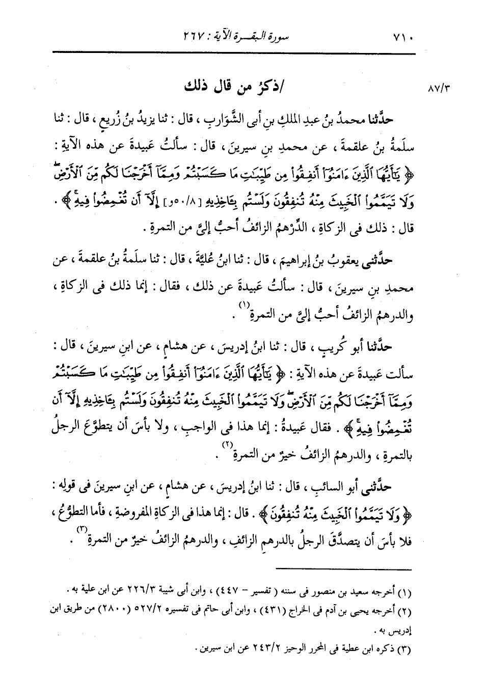 ذِكْرُ مَنْ قَالَ ذَلِكَ: حَدَّثَنَا مُحَمَّدُ بْنُ عَبْدِ الْمَلِكِ بْنِ أَبِي الشَّوَارِبِ، قَالَ: ثنا يَزِيدُ بْنُ زُرَيْعٍ، قَالَ: ثنا سَلَمَةُ بْنُ عَلْقَمَةَ، عَنْ مُحَمَّدِ بْنِ سِيرِينَ، قَالَ: سَأَلْتُ عُبَيْدَةَ عَنْ هَذِهِ الْآيَةِ: {يَا أَيُّهَا الَّذِينَ آمَنُوا §أَنْفِقُوا مِنْ طَيِّبَاتِ مَا كَسَبْتُمْ وَمِمَّا أَخْرَجْنَا لَكُمْ مِنَ الْأَرْضِ وَلَا تَيَمَّمُوا الْخَبِيثَ مِنْهُ تُنْفِقُونَ وَلَسْتُمْ بِآخِذِيهِ إِلَّا أَنْ تُغْمِضُوا فِيهِ} [البقرة: 267] قَالَ: «ذَلِكَ فِي الزَّكَاةِ، الدِّرْهَمُ الزَّائِفُ أَحَبُّ إِلَيَّ مِنَ التَّمْرَةِ»