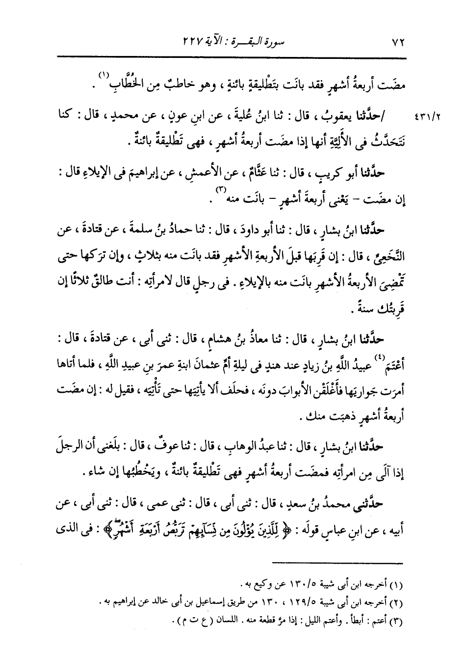 حَدَّثَنِي مُحَمَّدُ بْنُ سَعْدٍ، قَالَ: ثني أَبِي، قَالَ: ثني عَمِّي، قَالَ: ثني أَبِي، عَنْ أَبِيهِ، عَنِ ابْنِ عَبَّاسٍ، قَوْلَهُ: " {§لِلَّذِينَ يُؤْلُونَ مِنْ نِسَائِهِمْ تَرَبَّصُ أَرْبَعَةِ أَشْهُرٍ} [البقرة: 226] فِي الَّذِي -[73]- يُقْسِمُ، وَإِنْ مَضَتِ الْأَرْبَعَةُ الْأَشْهُرِ فَقَدْ حُرِّمَتْ عَلَيْهِ، فَتَعْتَدُّ عِدَّةَ الْمُطَلَّقَةِ وَهُوَ أَحَدُ الْخُطَّابِ "