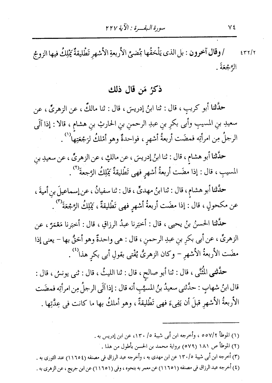 حَدَّثَنَا أَبُو هِشَامٍ، قَالَ: ثنا ابْنُ إِدْرِيسَ، عَنْ مَالِكٍ، عَنِ الزُّهْرِيِّ، عَنْ سَعِيدِ بْنِ الْمُسَيِّبِ، قَالَ: «§إِذَا مَضَتْ أَرْبَعَةُ أَشْهُرٍ فَهِيَ تَطْلِيقَةٌ يَمْلِكُ الرَّجْعَةَ»