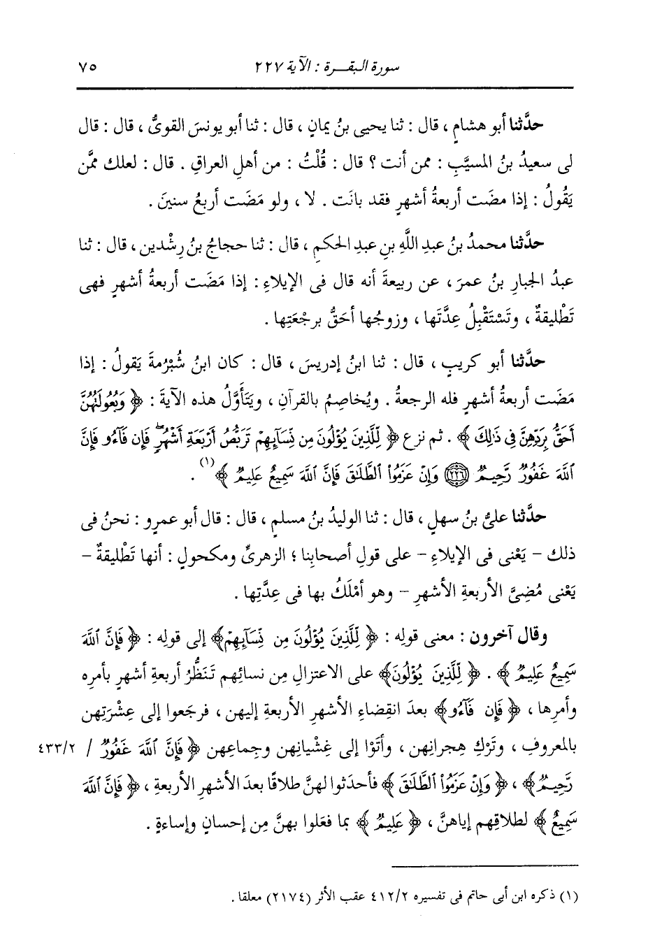 حَدَّثَنَا عَلِيُّ بْنُ سَهْلٍ، قَالَ: ثنا الْوَلِيدُ بْنُ مُسْلِمٍ، قَالَ: قَالَ أَبُو عَمْرٍو: «وَنَحْنُ فِي ذَلِكَ يَعْنِي فِي الْإِيلَاءِ عَلَى قَوْلِ أَصْحَابِنَا الزُّهْرِيِّ، وَمَكْحُولٍ، §أَنَّهَا تَطْلِيقَةٌ يَعْنِي مَضَى الْأَرْبَعَةُ الْأَشْهُرِ وَهُوَ أَمْلَكُ بِهَا فِي عِدَّتِهَا» وَقَالَ آخَرُونَ: مَعْنَى قَوْلِهِ: {لِلَّذِينَ يُؤْلُونَ مِنْ نِسَائِهِمْ} [البقرة: 226] إِلَى قَوْلِهِ: {فَإِنَّ اللَّهَ سُمَيْعٌ عَلِيمٌ} [البقرة: 227] لِلَّذِينَ يُؤْلُونَ عَلَى الِاعْتِزَالِ مِنْ نِسَائِهِمْ تَنْظُرُ أَرْبَعَةَ أَشْهُرٍ بِأَمْرِهِ وَأَمْرِهَا، فَإِنْ فَاءُوا بَعْدَ انْقِضَاءِ الْأَشْهُرِ الْأَرْبَعَةِ إِلَيْهِنَّ، فَرَجَعُوا إِلَى عِشْرَتِهِنَّ بِالْمَعْرُوفِ، وَتَرْكِ هِجْرَانِهِنَّ، وَأْتُوا إِلَى غِشْيَانِهِنَّ، وَجِمَاعِهِنَّ، فَإِنَّ اللَّهَ غَفُورٌ رَحِيمٌ، وَإِنْ عَزَمُوا الطَّلَاقَ فَأَحْدَثُوا لَهُنَّ طَلَاقًا بَعْدَ الْأَشْهُرِ الْأَرْبَعَةِ، فَإِنَّ اللَّهَ سُمَيْعٌ لِطَلَاقِهِمْ إِيَّاهُنَّ، عَلِيمٌ بِمَا فَعَلُوا بِهِنَّ مِنْ إِحْسَانٍ، وَإِسَاءَةٍ.