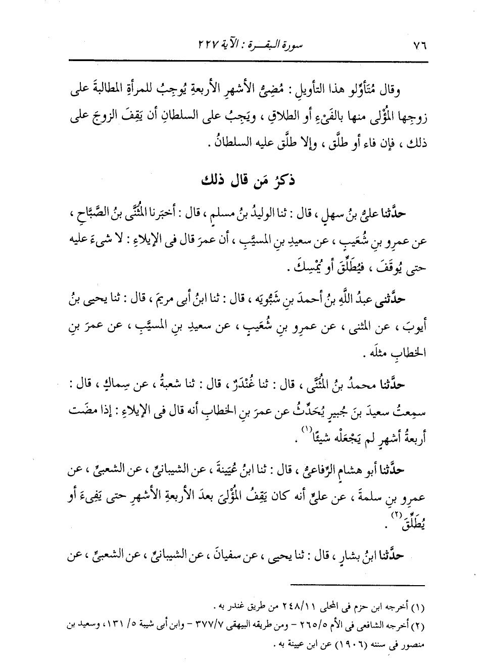 ذِكْرُ مَنْ قَالَ ذَلِكَ حَدَّثَنَا عَلِيُّ بْنُ سَهْلٍ، قَالَ: ثنا الْوَلِيدُ بْنُ مُسْلِمٍ، قَالَ: أَخْبَرَنَا الْمُثَنَّى بْنُ الصَّبَّاحِ، عَنْ عَمْرِو بْنِ شُعَيْبٍ، عَنْ سَعِيدِ بْنِ الْمُسَيِّبِ: أَنَّ عُمَرَ قَالَ فِي الْإِيلَاءِ: «§لَا شَيْءَ عَلَيْهِ حَتَّى يُوقَفَ، فَيُطَلِّقَ، أَوْ يُمْسِكَ» حَدَّثَنِي عَبْدُ اللَّهِ بْنُ أَحْمَدَ بْنِ شَبُّوَيْهِ، قَالَ: ثنا ابْنُ أَبِي مَرْيَمَ، قَالَ: ثنا يَحْيَى بْنُ أَيُّوبَ، عَنِ الْمُثَنَّى، عَنْ عَمْرِو بْنِ شُعَيْبٍ، عَنْ سَعِيدِ بْنِ الْمُسَيِّبِ، عَنْ عُمَرَ بْنِ الْخَطَّابِ، مِثْلَهُ