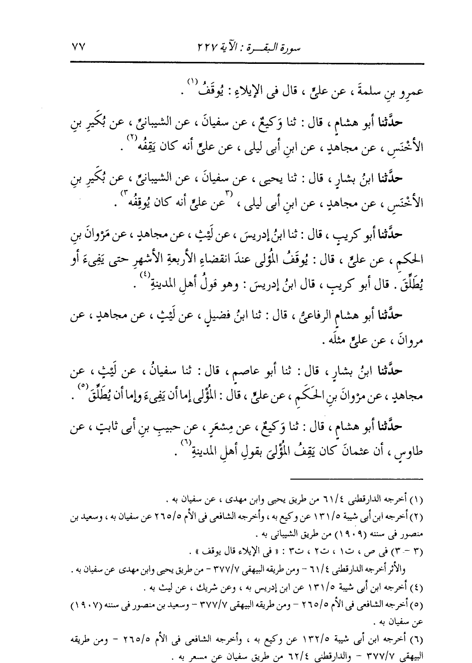 حَدَّثَنَا أَبُو هِشَامٍ، قَالَ: ثنا وَكِيعٌ، عَنْ مِسْعَرٍ، عَنْ حَبِيبِ بْنِ أَبِي ثَابِتٍ، عَنْ طَاوُسٍ، أَنَّ عُثْمَانَ، «كَانَ §يُقِفُ الْمُؤْلِيَ بِقَوْلِ أَهْلِ الْمَدِينَةِ» -[78]- حَدَّثَنَا أَحْمَدُ بْنُ حَازِمٍ، قَالَ: ثنا أَبُو نُعَيْمٍ، قَالَ: ثنا مِسْعَرٌ، عَنْ حَبِيبِ بْنِ أَبِي ثَابِتٍ، قَالَ: لَقِيتُ طَاوُسًا، فَسَأَلْتُهُ فَقَالَ: كَانَ عُثْمَانُ، يَأْخُذُ بِقَوْلِ أَهْلِ الْمَدِينَةِ