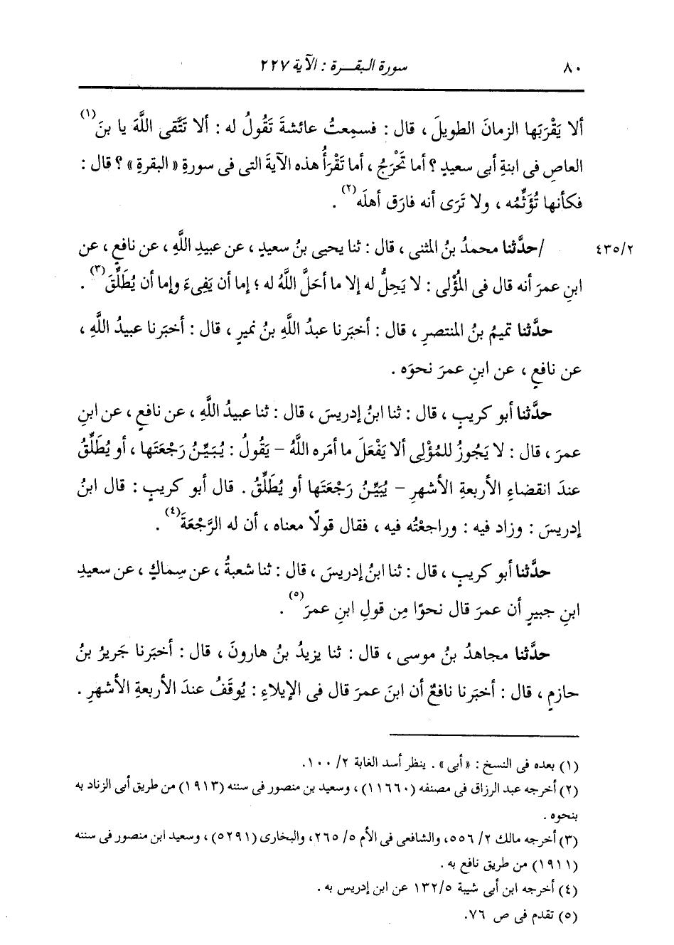 حَدَّثَنَا أَبُو كُرَيْبٍ، قَالَ: ثنا ابْنُ إِدْرِيسَ، قَالَ: ثنا عُبَيْدُ اللَّهِ، عَنْ نَافِعٍ، عَنِ ابْنِ عُمَرَ، قَالَ: " §لَا يَجُوزُ لِلْمُؤْلِي أَنْ لَا يَفْعَلَ مَا أَمَرَهُ اللَّهُ، يَقُولُ: يُبَيِّنُ رَجْعَتَهَا، أَوْ يُطَلِّقُ عِنْدَ انْقِضَاءِ الْأَرْبَعَةِ الْأَشْهُرِ يُبَيِّنُ رَجْعَتَهَا، أَوْ يُطَلِّقُ " قَالَ أَبُو كُرَيْبٍ. قَالَ ابْنُ إِدْرِيسَ وَزَادَ فِيهِ. وَرَاجَعْتُهُ فِيهِ، فَقَالَ قَوْلًا مَعْنَاهُ: إِنَّ لَهُ الرَّجْعَةَ حَدَّثَنَا أَبُو كُرَيْبٍ، قَالَ: ثنا ابْنُ إِدْرِيسَ، قَالَ: ثنا شُعْبَةُ، عَنْ سِمَاكٍ، عَنْ سَعِيدِ بْنِ جُبَيْرٍ، أَنَّ عُمَرَ، قَالَ نَحْوًا مِنْ قَوْلِ ابْنِ عُمَرَ