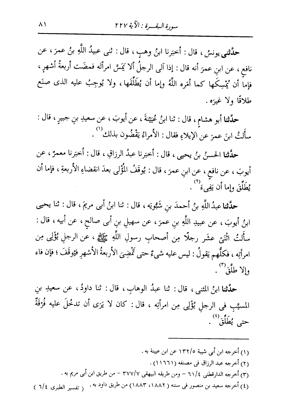 حَدَّثَنَا أَبُو هِشَامٍ، قَالَ: ثنا ابْنُ عُيَيْنَةَ، عَنْ أَيُّوبَ، عَنْ سَعِيدِ بْنِ جُبَيْرٍ، قَالَ: " سَأَلْتُ ابْنَ عُمَرَ، عَنِ الْإِيلَاءِ، فَقَالَ: «§الْأُمَرَاءُ يَقْضُونَ بِذَلِكَ»