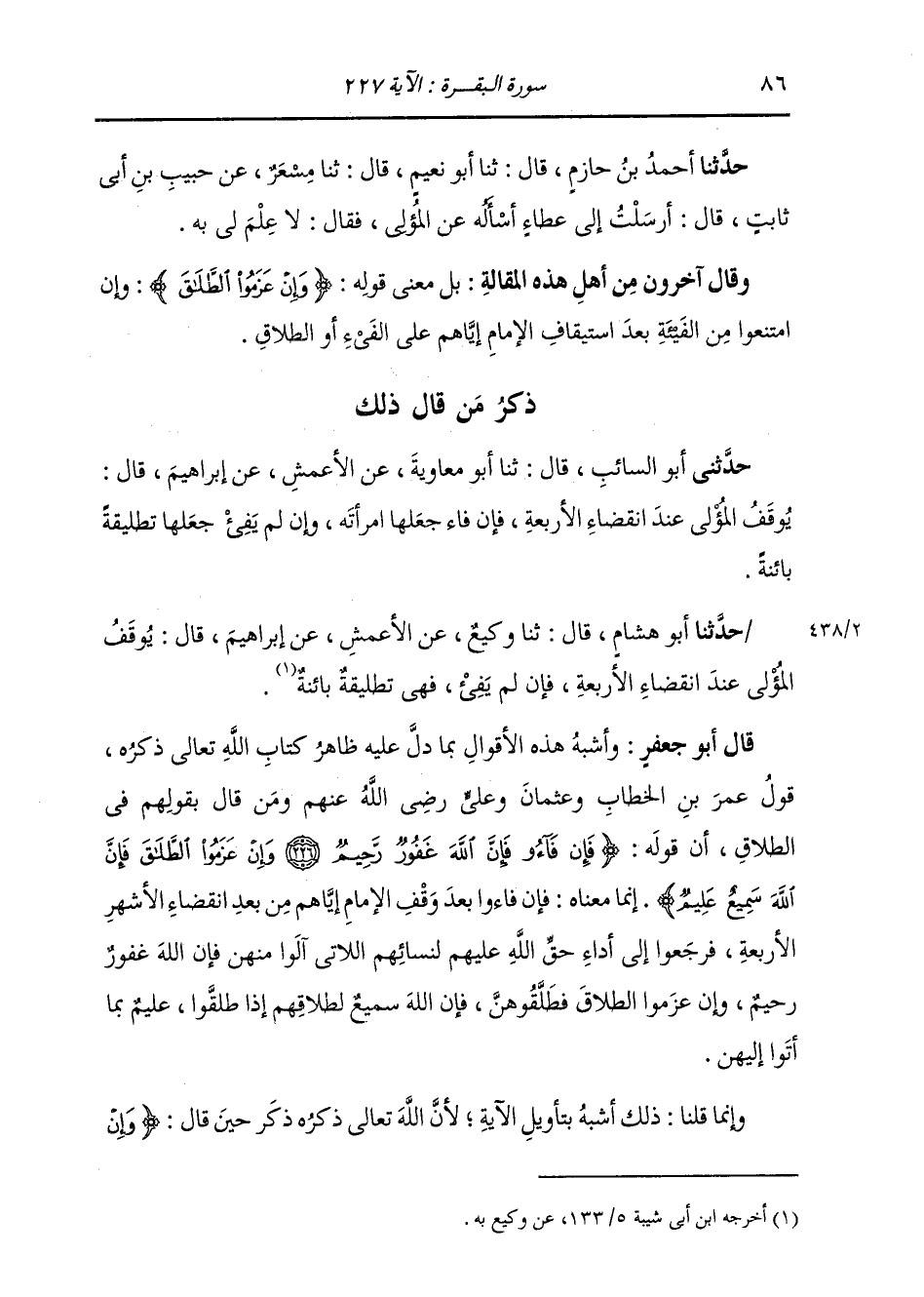 حَدَّثَنَا أَبُو هِشَامٍ، قَالَ: ثنا وَكِيعٌ، عَنِ الْأَعْمَشِ، عَنْ إِبْرَاهِيمَ، قَالَ: «§يُوقَفُ الْمُؤْلِي عِنْدَ انْقِضَاءِ الْأَرْبَعَةِ، فَإِنْ لَمْ يَفِئْ فَهِيَ تَطْلِيقَةٌ بَائِنَةٌ» قَالَ أَبُو جَعْفَرٍ: وَأَشْبَهُ هَذِهِ الْأَقْوَالِ بِمَا دَلَّ عَلَيْهِ ظَاهِرُ كِتَابِ اللَّهِ تَعَالَى ذِكْرُهُ، قَوْلُ عُمَرَ بْنِ الْخَطَّابِ، وَعُثْمَانَ، وَعَلِيٍّ رَضِيَ اللَّهُ عَنْهُمْ وَمَنْ قَالَ بِقَوْلِهِمْ فِي الطَّلَاقِ. أَنَّ قَوْلَهُ: {فَإِنْ فَاءُوا} فَإِنَّ اللَّهَ غَفُورٌ رَحِيمٌ وَإِنْ عَزَمُوا الطَّلَاقَ فَإِنَّ اللَّهَ سُمَيْعٌ عَلِيمٌ إِنَّمَا مَعْنَاهُ: فَإِنْ فَاءُوا بَعْدَ وَقْفِ الْإِمَامِ إِيَّاهُمْ مِنْ بَعْدِ انْقِضَاءِ الْأَشْهُرِ الْأَرْبَعَةِ، فَرَجَعُوا إِلَى أَدَاءِ حَقِّ اللَّهِ عَلَيْهِمْ لِنِسَائِهِمُ اللَّاتِي آلَوْا مِنْهُنَّ، فَإِنَّ اللَّهَ لَهُمْ غَفُورٌ رَحِيمٌ، وَإِنْ عَزَمُوا الطَّلَاقَ فَطَلِّقُوهُنَّ، فَإِنَّ اللَّهَ سُمَيْعٌ لِطَلَاقِهِمْ إِذَا طَلَّقُوا، عَلِيمٌ بِمَا أَتَوْا إِلَيْهِنَّ. وَإِنَّمَا قُلْنَا ذَلِكَ أَشْبَهُ بِتَأْوِيلِ الْآيَةِ، لِأَنَّ اللَّهَ تَعَالَى ذِكْرُهُ ذَكَرَ حِينَ قَالَ: {وَإِنْ -[87]- عَزَمُوا الطَّلَاقَ فَإِنَّ اللَّهَ سُمَيْعٌ عَلِيمٌ} [البقرة: 227] وَمَعْلُومٌ أَنَّ انْقِضَاءَ الْأَشْهُرِ الْأَرْبَعَةِ غَيْرُ مَسْمُوعٍ، وَإِنَّمَا هُوَ مَعْلُومٌ، فَلَوْ كَانَ عَزْمُ الطَّلَاقِ انْقِضَاءُ الْأَشْهُرِ الْأَرْبَعَةِ لَمْ تَكُنِ الْآيَةُ مَخْتُومَةً بِذِكْرِ اللَّهِ الْخَبَرَ عَنِ اللَّهِ تَعَالَى ذِكْرُهُ أَنَّهُ سُمَيْعٌ عَلِيمٌ كَمَا أَنَّهُ لَمْ يَخْتَمِ الْآيَةَ الَّتِي ذَكَرَ فِيهَا الْفَيْءَ إِلَى طَاعَتِهِ فِي مُرَاجَعَةِ الْمُؤْلِي زَوْجَتَهُ الَّتِي آلَى مِنْهَا وَأَدَاءِ حَقِّهَا إِلَيْهَا بِذِكْرِ الْخَبَرِ عَنْ أَنَّهُ شَدِيدُ الْعِقَابِ، إِذْ لَمْ يَكُنْ مَوْضِعَ وَعِيدٍ عَلَى مَعْصِيَةٍ، وَلَكِنَّهُ خَتَمَ ذَلِكَ بِذِكْرِ الْخَبَرِ عَنْ وَصْفِهِ نَفْسَهُ تَعَالَى ذِكْرُهُ بِأَنَّهُ غَفُورٌ رَحِيمٌ، إِذْ كَانَ مَوْضِعُ، وَعْدِ الْمُنِيبِ عَلَى إِنَابَتِهِ إِلَى طَاعَتِهِ، فَكَذَلِكَ خَتَمَ الْآيَةَ الَّتِي فِيهَا ذِكْرُ الْقَوْلِ، وَالْكَلَامِ بِصِفَةِ نَفْسِهِ بِأَنَّهُ لِلْكَلَامِ سُمَيْعٌ وَبِالْفِعْلِ عَلِيمٌ، فَقَالَ تَعَالَى ذِكْرُهُ: وَإِنْ عَزَمَ الْمُؤْلُونَ عَلَى نِسَائِهِمْ عَلَى طَلَاقِ مَنْ آلُوا مِنْهُ مِنْ نِسَائِهِمْ، فَإِنَّ اللَّهَ سُمَيْعٌ لِطَلَاقِهِمْ إِيَّاهُنَّ إِنْ طَلَّقُوهُنَّ، عَلِيمٌ بِمَا أَتَوْا إِلَيْهِنَّ مِمَّا يَحِلُّ لَهُمْ، وَيَحْرُمُ عَلَيْهِمْ. وَقَدِ اسْتَقْصَيْنَا الْبَيَانَ عَنِ الدَّلَالَةِ عَلَى صِحَّةِ هَذَا الْقَوْلِ فِي كِتَابِنَا كِتَابِ «اللَّطِيفُ مِنَ الْبَيَانِ عَنْ أَحْكَامِ شَرَائِعِ الدِّينِ» فَكَرِهْنَا إِعَادَتَهُ فِي هَذَا الْمَوْضِعِ