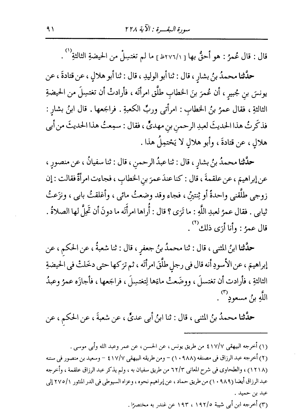 حَدَّثَنَا مُحَمَّدُ بْنُ بَشَّارٍ، قَالَ: ثنا عَبْدُ الرَّحْمَنِ، قَالَ: ثنا سُفْيَانُ، عَنْ مَنْصُورٍ، عَنْ إِبْرَاهِيمَ، عَنْ عَلْقَمَةَ، قَالَ: " كُنَّا عِنْدَ عُمَرَ بْنِ الْخَطَّابِ، فَجَاءَتِ امْرَأَةٌ فَقَالَتْ: إِنَّ زَوْجِيَ طَلَّقَنِي وَاحِدَةً أَوْ ثِنْتَيْنٍ، فَجَاءَ وَقَدْ وَضَعْتُ مَائِي، وَأَغْلَقْتُ بَابِي، وَنَزَعْتُ ثِيَابِي. فَقَالَ عُمَرُ، لِعَبْدِ اللَّهِ: مَا تَرَى؟ قَالَ: §أُرَاهَا امْرَأَتَهُ مَا دُونَ أَنْ تَحِلَّ لَهَا الصَّلَاةُ. قَالَ عُمَرُ: وَأَنَا أَرَى ذَلِكَ "