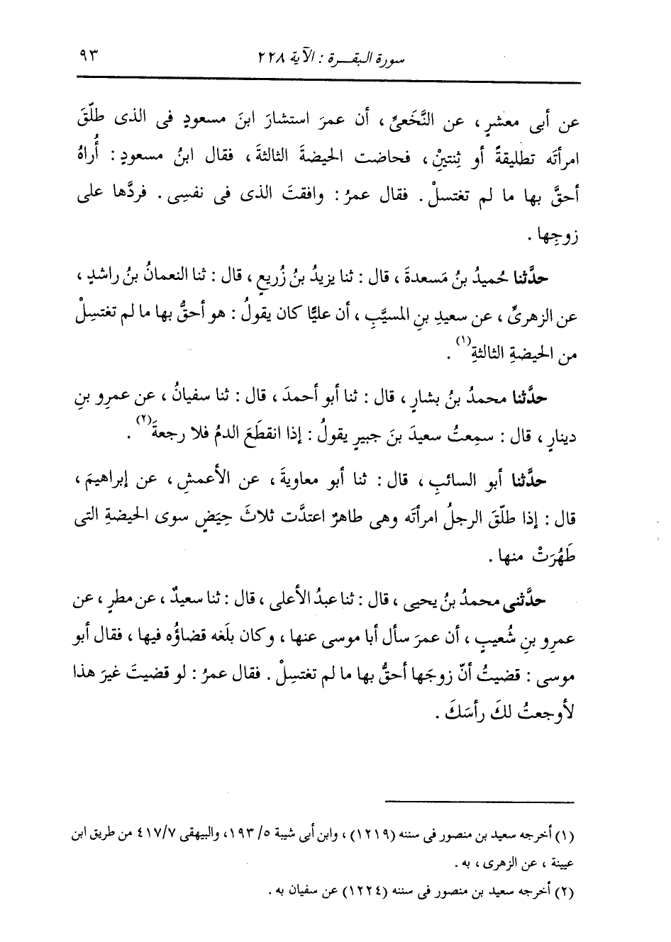 حَدَّثَنَا حُمَيْدُ بْنُ مَسْعَدَةَ، قَالَ: ثنا يَزِيدُ بْنُ زُرَيْعٍ، قَالَ: ثنا النُّعْمَانُ بْنُ رَاشِدٍ، عَنِ الزُّهْرِيِّ، عَنْ سَعِيدِ بْنِ الْمُسَيِّبِ: أَنَّ عَلِيًّا، كَانَ يَقُولُ: «§هُوَ أَحَقُّ بِهَا مَا لَمْ تَغْتَسِلْ مِنَ الْحَيْضَةِ الثَّالِثَةِ»