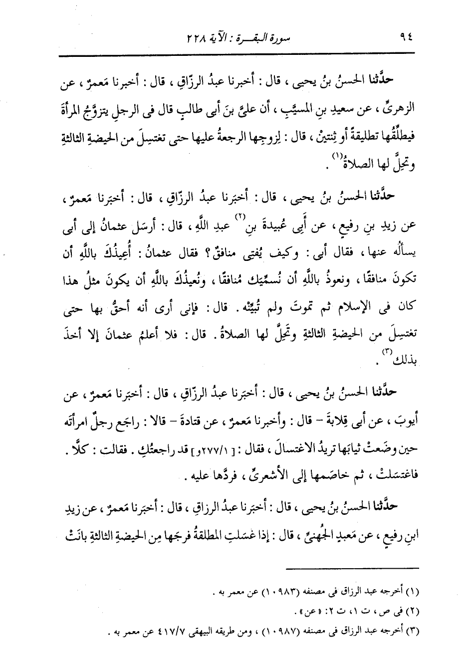 حَدَّثَنَا الْحَسَنُ بْنُ يَحْيَى، قَالَ: أَخْبَرَنَا عَبْدُ الرَّزَّاقِ، قَالَ: أَخْبَرَنَا مَعْمَرٌ، عَنْ زَيْدِ بْنِ رُفَيْعٍ، عَنْ أَبِي عُبَيْدَةَ بْنِ عَبْدِ اللَّهِ، قَالَ: " أَرْسَلَ عُثْمَانُ، إِلَى أَبِي يَسْأَلُهُ عَنْهَا، فَقَالَ أَبِي: وَكَيْفَ يُفْتِي مُنَافِقٌ؟ فَقَالَ عُثْمَانُ: أُعِيذُكَ بِاللَّهِ أَنْ تَكُونَ مُنَافِقًا، وَنَعُوذُ بِاللَّهِ أَنْ نُسَمِّيَكَ مُنَافِقًا، وَنُعِيذُكَ بِاللَّهِ أَنْ يَكُونَ مِثْلُ هَذَا كَانَ فِي الْإِسْلَامِ ثُمَّ تَمُوتُ وَلَمْ تُبَيِّنْهُ قَالَ: «فَإِنِّي §أَرَى أَنَّهُ حَقٌّ بِهَا حَتَّى تَغْتَسِلَ مِنَ الْحَيْضَةِ الثَّالِثَةِ وَتَحُلَّ لَهَا الصَّلَاةُ» قَالَ: فَلَا أَعْلَمُ عُثْمَانَ، إِلَّا أَخَذَ بِذَلِكَ " 3