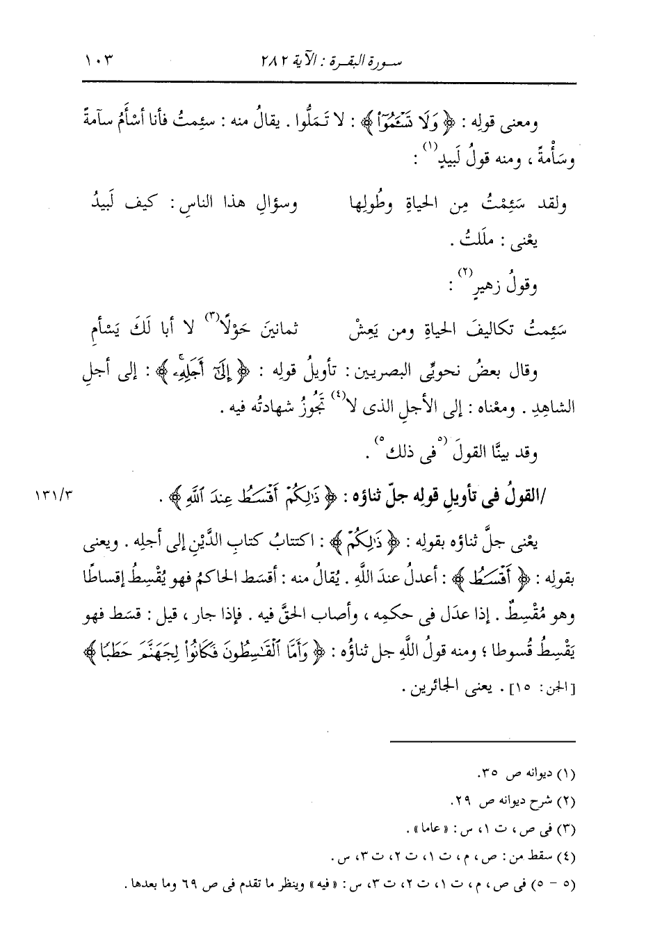 §الْقَوْلُ فِي تَأْوِيلِ قَوْلِهِ تَعَالَى: {ذَلِكُمْ أَقْسَطُ عِنْدَ اللَّهِ} [البقرة: 282] يَعْنِي جَلَّ ثناؤُهُ بِقَوْلِهِ: ذَلِكُمُ اكْتِتَابُ كِتَابِ الدَّيْنِ إِلَى أَجَلِهِ، وَيَعْنِي بِقَوْلِهِ {أَقْسَطُ} [البقرة: 282] : أَعْدَلُ عِنْدَ اللَّهِ، يُقَالُ مِنْهُ: أَقْسَطَ الْحَاكِمُ فَهُوَ يُقْسِطَ إِقْسَاطًا وَهُوَ مُقْسِطٌ، إِذَا عَدَلَ فِي حُكْمِهِ، وَأَصَابَ الْحَقَّ فِيهِ، فَإِذَا جَارَ قِيلَ: قَسَطَ فَهُوَ يَقْسِطُ قُسُوطًا، وَمِنْهُ قَوْلُ اللَّهِ عَزَّ وَجَلَّ: {وَأَمَّا الْقَاسِطُونَ فَكَانُوا لِجَهَنَّمَ حَطَبًا} [الجن: 15] يَعْنِي الْجَائِرُونَ -[104]- وَبِمِثْلِ مَا قُلْنَا فِي ذَلِكَ قَالَ جَمَاعَةُ أَهْلِ التَّأْوِيلِ