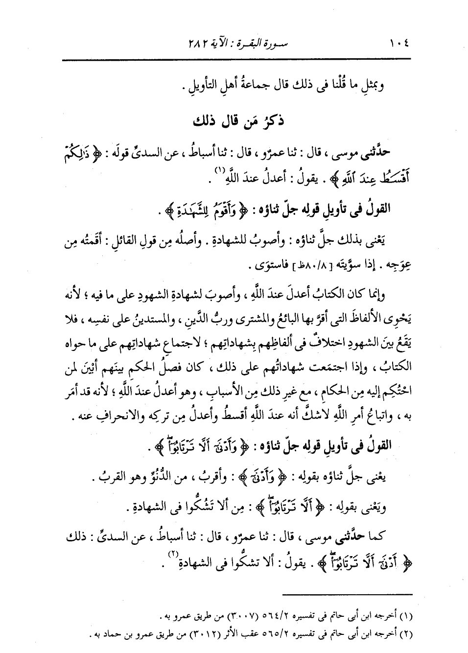 كَمَا: حَدَّثَنَا مُوسَى، قَالَ: ثنا عَمْرٌو، قَالَ: ثنا أَسْبَاطٌ، عَنِ السُّدِّيِّ: {§ذَلِكَ أَدْنَى أَنْ لَا تَرْتَابُوا} يَقُولُ: «أَنْ لَا تَشُكُّوا فِي الشَّهَادَةِ» -[105]- وَهُوَ تَفْتَعِلُ مِنَ الرِّيبَةِ، وَمَعْنَى الْكَلَامِ: وَلَا تَمَلُّوا أَيُّهَا الْقَوْمُ أَنْ تَكْتُبُوا الْحَقَّ الَّذِي لَكُمْ قِبَلَ مَنْ دَايَنْتُمُوهُ مِنَ النَّاسِ إِلَى أَجَلٍ صَغِيرًا كَانَ ذَلِكَ الْحَقُّ، قَلِيلًا أَوْ كَثِيرًا، فَإِنَّ كِتَابَكُمْ ذَلِكَ أَعْدَلُ عِنْدَ اللَّهِ وَأَصْوَبُ لِشَهَادَةِ شُهُودِكُمْ عَلَيْهِ، وَأَقْرَبُ لَكُمْ أَنْ لَا تَشُكُّوا فِيمَا شَهِدَ بِهِ شُهُودُكُمْ عَلَيْكُمْ مِنَ الْحَقِّ وَالْأَجَلِ إِذَا كَانَ مَكْتُوبًا
