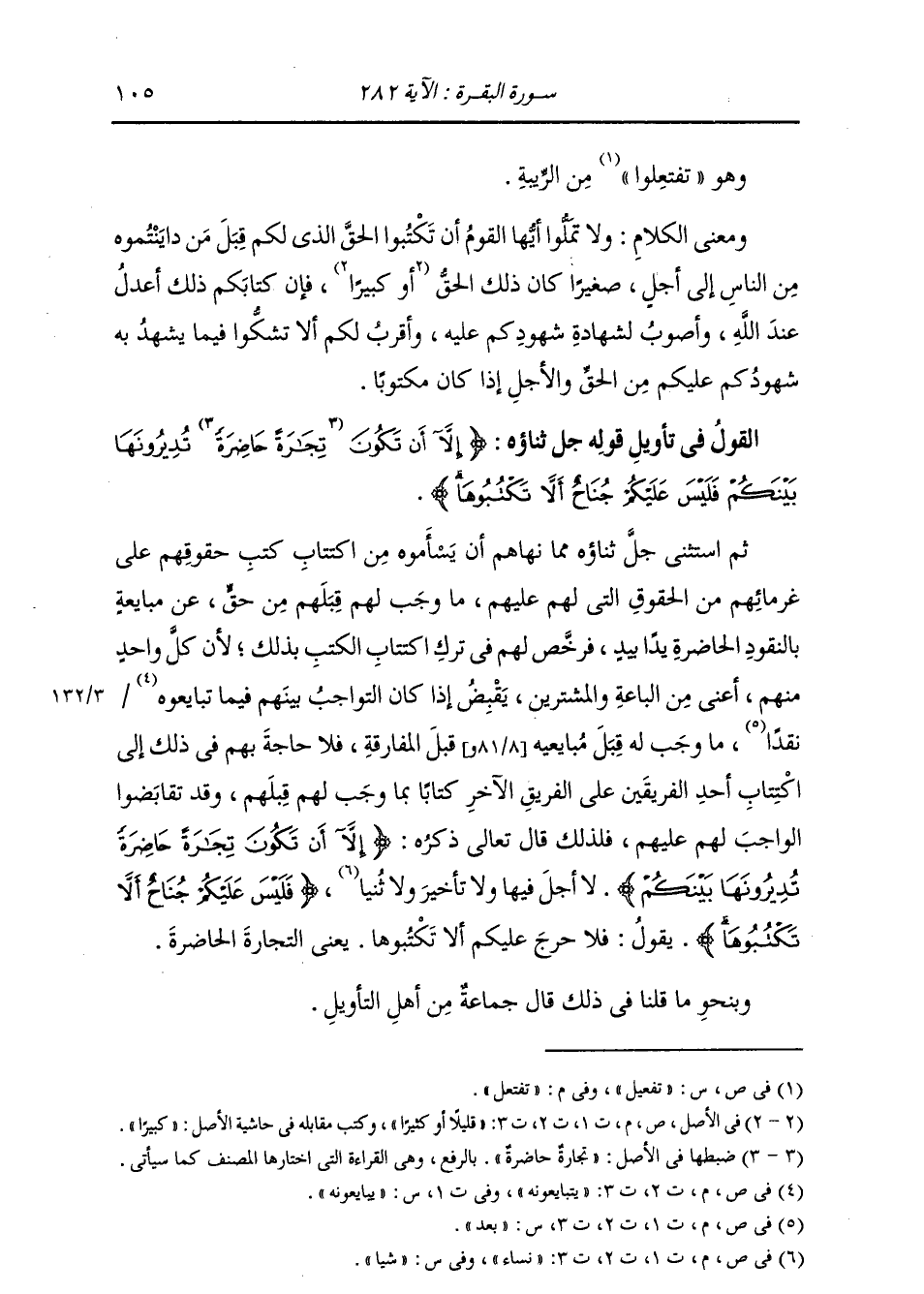 §الْقَوْلُ فِي تَأْوِيلِ قَوْلِهِ تَعَالَى: {إِلَّا أَنْ تَكُونَ تِجَارَةً حَاضِرَةً تُدِيرُونَهَا بَيْنَكُمْ فَلَيْسَ عَلَيْكُمْ جُنَاحٌ أَلَّا تَكْتُبُوهَا} [البقرة: 282] ثُمَّ اسْتَثْنَى جَلَّ ذِكْرُهُ مِمَّا نَهَاهُمْ عَنْهُ أَنْ يَسْأَمُوهُ مِنَ اكْتِتَابِ كُتُبِ حُقُوقِهِمْ عَلَى غُرَمَائِهِمْ بِالْحُقُوقِ الَّتِي لَهُمْ عَلَيْهِمْ، مَا وَجَبَ لَهُمْ قِبَلَهُمْ مِنْ حَقٍّ عَنْ مُبَايَعَةٍ بِالنُّقُودِ الْحَاضِرَةِ يَدًا بِيَدٍ، فَرَخَّصَ لَهُمْ فِي تَرْكِ اكْتِتَابِ الْكُتُبِ بِذَلِكَ؛ لِأَنَّ كُلَّ وَاحِدٍ مِنْهُمْ أَعْنِي مِنَ الْبَاعَةِ وَالْمُشْتَرِينَ، يَقْبِضُ إِذَا كَانَ الْوَاجِبُ بَيْنَهُمْ فِيمَا يَتَبَايَعُونَهُ نَقْدًا مَا وَجَبَ لَهُ قِبَلَ مُبَايِعِيهِ قَبْلَ الْمُفَارَقَةِ، فَلَا حَاجَةَ لَهُمْ فِي ذَلِكَ إِلَى اكْتِتَابِ أَحَدِ الْفَرِيقَيْنِ عَلَى الْفَرِيقِ الْآخَرِ كِتَابًا بِمَا وَجَبَ لَهُمْ قِبَلَهُمْ وَقَدْ تَقَابَضُوا الْوَاجِبَ لَهُمْ عَلَيْهِمْ، فَلِذَلِكَ قَالَ تَعَالَى ذِكْرُهُ: {إِلَّا أَنْ تَكُونَ تِجَارَةً حَاضِرَةً تُدِيرُونَهَا بَيْنَكُمْ} [البقرة: 282] لَا أَجَلَ فِيهَا وَلَا تَأْخِيرَ وَلَا نِسَاءَ {فَلَيْسَ عَلَيْكُمْ جُنَاحٌ أَلَّا تَكْتُبُوهَا} [البقرة: 282] يَقُولُ: فَلَا حَرَجَ عَلَيْكُمْ أَلَّا تَكْتُبُوهَا، يَعْنِي التِّجَارَةَ الْحَاضِرَةَ. وَبِنَحْوِ الَّذِي قُلْنَا فِي ذَلِكَ قَالَ جَمَاعَةٌ مِنْ أَهْلِ التَّأْوِيلِ