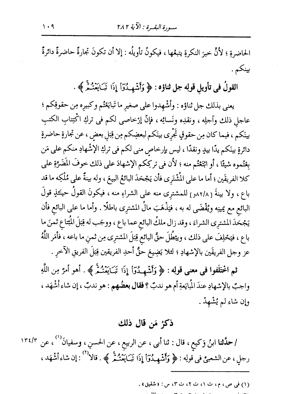 ذِكْرُ مَنْ قَالَ ذَلِكَ: حَدَّثَنَا ابْنُ وَكِيعٍ، قَالَ: ثنا أَبِي، عَنِ الرَّبِيعِ، عَنِ الْحَسَنِ، وَشَقِيقٍ، عَنْ رَجُلٍ، عَنِ الشَّعْبِيِّ، فِي قَوْلِهِ: {§وَأَشْهِدُوا إِذَا تَبَايَعْتُمْ} [البقرة: 282] قَالَ: «إِنْ شَاءَ أَشْهَدَ، -[110]- وَإِنْ شَاءَ لَمْ يُشْهِدْ» أَلَمْ تَسْمَعْ إِلَى قَوْلِهِ: {فَإِنْ أَمِنَ بَعْضُكُمْ بَعْضًا فَلْيُؤَدِّ الَّذِي اؤْتُمِنَ أَمَانَتَهُ} [البقرة: 283]