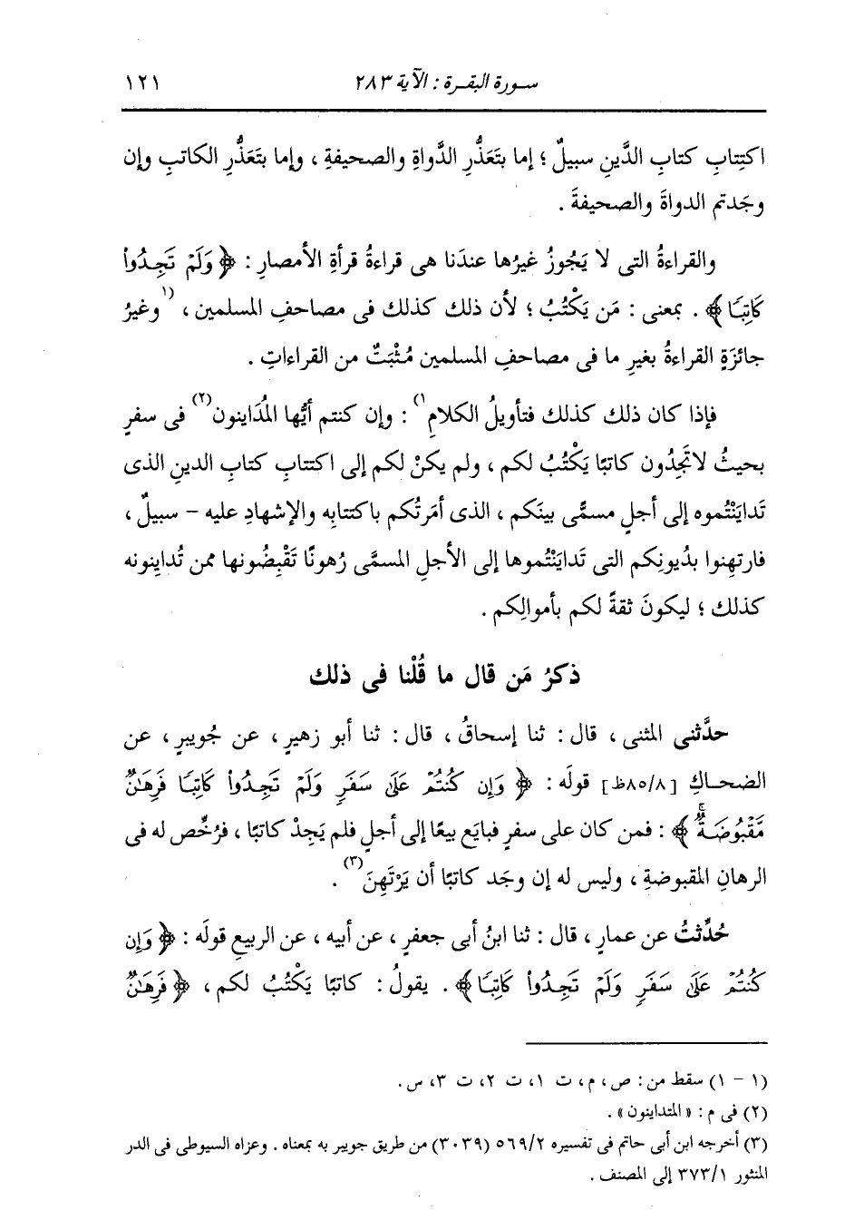 اكْتِتَابِ كِتَابِ الدَّيْنِ سَبِيلٌ، إِمَّا بِتَعَذُّرِ الدَّوَاةِ وَالصَّحِيفَةِ، وَإِمَّا بِتَعَذُّرِ الْكَاتِبِ وَإِنْ وَجَدْتُمُ الدَّوَاةَ وَالصَّحِيفَةَ. وَالْقِرَاءَةُ الَّتِي لَا يَجُوزُ غَيْرُهَا عِنْدَنَا هِيَ قِرَاءَةُ الْأَمْصَارِ: {وَلَمْ تَجِدُوا كَاتِبًا} [البقرة: 283] بِمَعْنَى: مَنْ يَكْتُبُ؛ لِأَنَّ ذَلِكَ كَذَلِكَ فِي مَصَاحِفِ الْمُسْلِمِينَ، وَإِنْ كُنْتُمْ أَيُّهَا الْمُتَدَايِنُونَ فِي سَفَرٍ بِحَيْثُ لَا تَجِدُونَ كَاتِبًا يَكْتُبُ لَكُمْ، وَلَمْ يَكُنْ لَكُمْ إِلَى اكْتِتَابِ كِتَابِ الدَّيْنِ الَّذِي تَدَايَنْتُمُوهُ إِلَى أَجَلٍ مُسَمًّى بَيْنَكُمُ الَّذِي أَمَرْتُكُمْ بِاكْتِتَابِهِ وَالْإِشْهَادِ عَلَيْهِ سَبِيلٌ، فَارْتَهِنُوا بِدِيُونِكُمُ الَّتِي تَدَايَنْتُمُوهَا إِلَى الْأَجَلِ الْمُسَمَّى رُهُونًا تَقْبِضُونَهَا مِمَّنْ تُدَايِنُونَهُ كَذَلِكَ لِيَكُونَ ثِقَةً لَكُمْ بِأَمْوَالِكُمْ