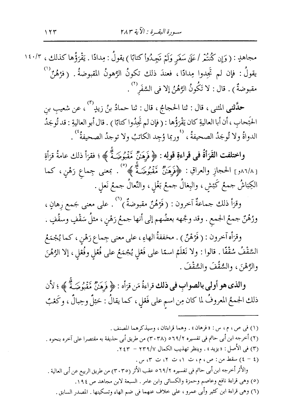 حَدَّثَنِي الْمُثَنَّى، قَالَ: ثنا الْحَجَّاجُ، قَالَ: ثنا حَمَّادُ بْنُ زَيْدٍ، عَنْ شُعَيْبِ بْنِ الْحَبْحَابِ، قَالَ: إِنَّ أَبَا الْعَالِيَةِ §كَانَ يَقْرَؤُهَا: «فَإِنْ لَمْ تَجِدُوا كِتَابًا» قَالَ أَبُو الْعَالِيَةِ: «تُوجَدُ الدَّوَاةُ وَلَا تُوجَدُ الصَّحِيفَةُ» وَاخْتَلَفَ الْقُرَّاءُ فِي قِرَاءَةِ قَوْلِهِ: {فَرِهَانٌ مَقْبُوضَةٌ} [البقرة: 283] فَقَرَأَ ذَلِكَ عَامَّةُ قُرَّاءِ الْحِجَازِ وَالْعِرَاقِ: {فَرِهَانٌ مَقْبُوضَةٌ} [البقرة: 283] بِمَعْنَى جِمَاعِ رَهْنٍ، كَمَا الْكِبَاشِ جِمَاعُ كَبْشٍ، وَالْبِغَالُ جِمَاعُ بَغْلٍ، وَالنِّعَالُ جِمَاعُ نَعْلٍ، وَقَرَأَ ذَلِكَ جَمَاعَةٌ آخَرُونَ: (فَرُهُنٌ مَقْبُوضَةٌ) عَلَى مَعْنَى جَمْعِ رِهَانٍ وَرُهْنٍ جَمْعَ الْجَمْعِ، وَقَدْ وَجَّهَهُ بَعْضُهُمْ إِلَى أَنَّهَا جَمْعَ رَهْنٍ مِثْلَ سَقْفٍ وَسُقُفٍ، وَقَرَأَهُ آخَرُونَ: (فَرُهْنٌ) مُخَفَّفَةَ الْهَاءِ، عَلَى مَعْنَى جِمَاعِ رَهْنٍ، كَمَا تَجْمَعُ السَّقْفَ سُقْفًا؛ قَالُوا: وَلَا نَعْلَمُ اسْمًا عَلَى فَعْلٍ يُجْمَعُ عَلَى فُعُلٍ وَفُعْلٍ إِلَّا الرُّهُنَ وَالرُّهْنَ وَالسُّقُفَ وَالسُّقْفَ. وَالَّذِي هُوَ أَوْلَى بِالصَّوَابِ فِي ذَلِكَ قِرَاءَةُ مَنْ قَرَأَهُ: {فَرِهَانٌ مَقْبُوضَةٌ} [البقرة: 283] لِأَنَّ ذَلِكَ الْجَمْعَ الْمَعْرُوفَ لِمَا كَانَ مِنَ اسْمٍ عَلَى فَعْلٍ، كَمَا يُقَالُ حَبْلٌ وَحِبَالٌ، وَكَعْبٌ