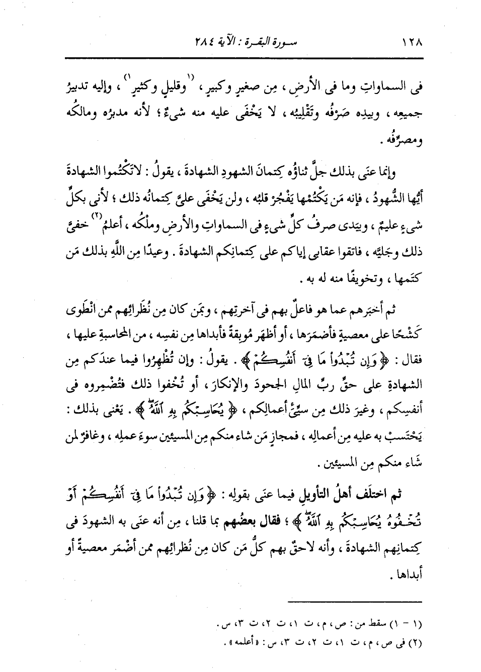 فِي السَّمَوَاتِ وَمَا فِي الْأَرْضِ مِنْ صَغِيرٍ وَكَبِيرٍ، وَإِلَيْهِ تَدْبِيرُ جَمِيعِهِ، وَبِيَدِهِ صَرْفُهُ وَتَقْلِيبُهُ، لَا يَخْفَى عَلَيْهِ مِنْهُ شَيْءٌ؛ لِأَنَّهُ مُدَبِّرُهُ وَمَالِكُهُ وَمُصَرِّفُهُ، وَإِنَّمَا عَنَى بِذَلِكَ جَلَّ ثناؤُهُ كِتْمَانَ الشُّهُودِ الشَّهَادَةَ، يَقُولُ: لَا تَكْتُمُوا الشَّهَادَةَ أَيُّهَا الشُّهُودُ، وَمَنْ يَكْتُمْهَا يَفْجُرْ قَلْبُهُ، وَلَنْ يَخْفَى عَلَيَّ كِتْمَانُهُ، وَذَلِكَ لِأَنِّي بِكُلِّ شَيْءٍ عَلِيمٌ، وَبِيَدِي صَرْفُ كُلِّ شَيْءٍ فِي السَّمَاوَاتِ وَالْأَرْضِ وَمُلْكُهُ، أَعْلَمُهُ خَفِيَّ ذَلِكَ وَجَلِيَّهُ، فَاتَّقُوا عِقَابِي إِيَّاكُمْ عَلَى كِتْمَانِكُمُ الشَّهَادَةَ. وَعِيدًا مِنَ اللَّهِ بِذَلِكَ مَنْ كَتَمَهَا وَتَخْوِيفًا مِنْهُ لَهُ بِهِ، ثُمَّ أَخْبَرَهُمْ عَمَّا هُوَ فَاعِلٌ بِهِمْ فِي آخِرَتِهِمْ وَبِمَنْ كَانَ مِنْ نُظَرَائِهِمْ مِمَّنِ انْطَوَى كُشْحًا عَلَى مَعْصِيَةٍ فَأَضْمَرَهَا، أَوْ أَظْهَرَ مُوبِقَةً فَأَبْدَاهَا مِنْ نَفْسِهِ مِنَ الْمُحَاسَبَةِ عَلَيْهَا، فَقَالَ: {وَإِنْ تُبْدُوا مَا فِي أَنْفُسِكُمْ أَوْ تُخْفُوهُ} [البقرة: 284] يَقُولُ: وَإِنْ تُظْهِرُوا فِيمَا عِنْدَكُمْ مِنَ الشَّهَادَةِ عَلَى حَقِّ رَبِّ الْمَالِ الْجُحُودَ وَالْإِنْكَارَ، أَوْ تُخْفُوا ذَلِكَ فَتُضْمِرُوهُ فِي أَنْفُسِكُمْ وَغَيْرَ ذَلِكَ مِنْ سَيِّئِ أَعْمَالِكُمْ، {يُحَاسِبْكُمْ بِهِ اللَّهُ} [البقرة: 284] يَعْنِي بِذَلِكَ: يَحْتَسِبُ بِهِ عَلَيْكُمْ مِنْ أَعْمَالِهِ، فَيُجَازِي مَنْ شَاءَ مِنْكُمْ مِنَ الْمُسِيئِينَ بِسُوءِ عَمَلِهِ، وَغَافِرٌ لِمَنْ شَاءَ مِنْكُمْ مِنَ الْمُسِيئِينَ ثُمَّ اخْتَلَفَ أَهْلُ التَّأْوِيلِ فِيمَا عَنَى بِقَوْلِهِ: {وَإِنْ تُبْدُوا مَا فِي أَنْفُسِكُمْ أَوْ تُخْفُوهُ يُحَاسِبْكُمْ بِهِ اللَّهُ} [البقرة: 284] فَقَالَ بَعْضُهُمْ بِمَا قُلْنَا مِنْ أَنَّهُ عَنَى بِهِ الشُّهُودَ فِي كِتْمَانِهِمُ الشَّهَادَةَ، وَأَنَّهُ لَاحِقٌ بِهِمْ كُلُّ مَنْ كَانَ مِنْ نُظَرَائِهِمْ مِمَّنْ أَضْمَرَ مَعْصِيَةً أَوْ أَبْدَاهَا