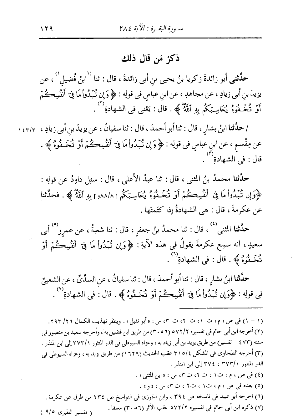 حَدَّثَنَا ابْنُ بَشَّارٍ، قَالَ: ثنا أَبُو أَحْمَدَ، قَالَ: ثنا سُفْيَانُ، عَنِ السُّدِّيِّ، عَنِ الشَّعْبِيِّ، فِي قَوْلِهِ: {§وَإِنْ تُبْدُوا مَا فِي أَنْفُسِكُمْ أَوْ تُخْفُوهُ} [البقرة: 284] قَالَ: «فِي الشَّهَادَةِ»