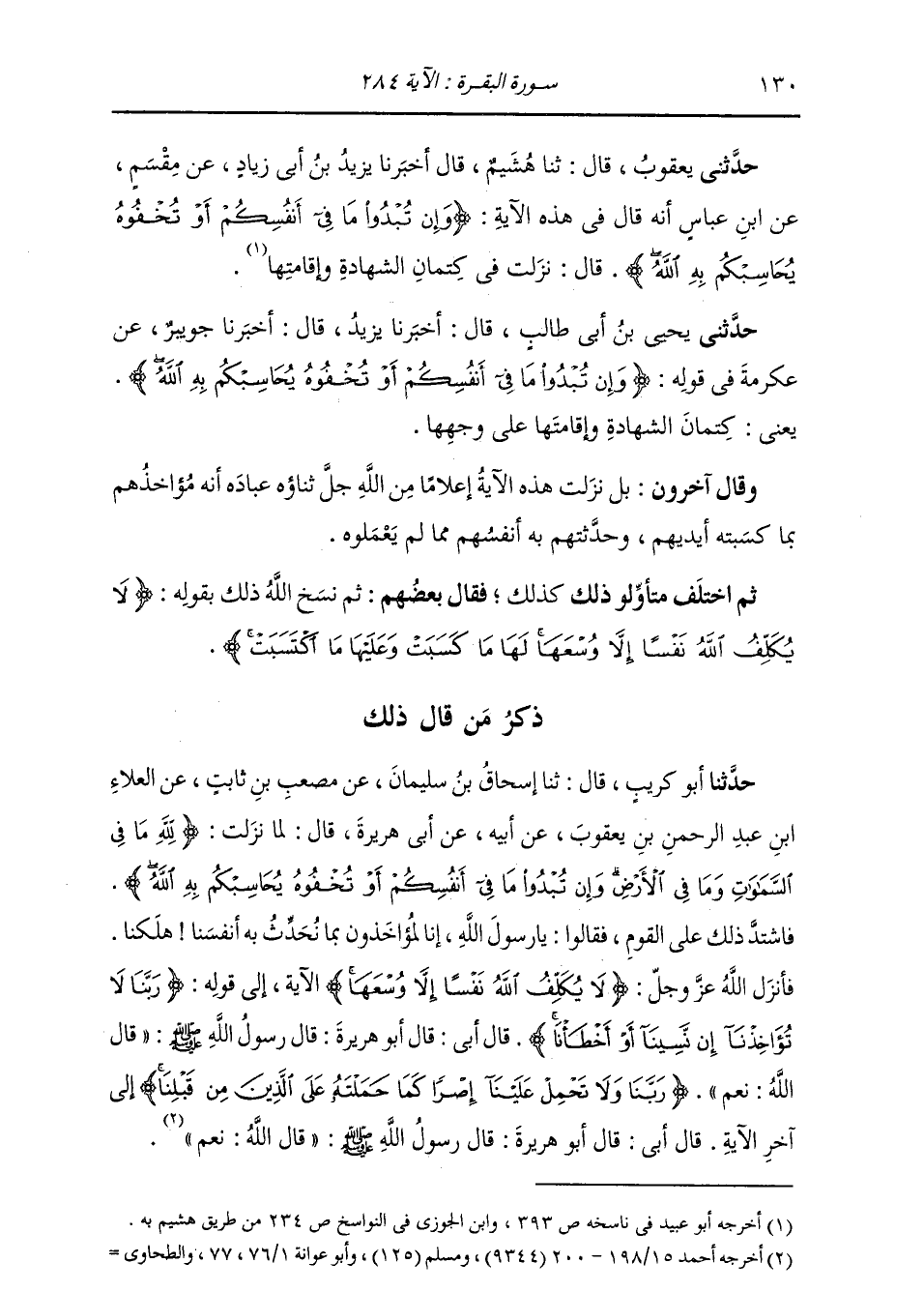 حَدَّثَنِي يَحْيَى بْنُ أَبِي طَالِبٍ قَالَ: أَخْبَرَنَا يَزِيدُ، قَالَ: أَخْبَرَنَا جُوَيْبِرٌ، عَنْ عِكْرِمَةَ فِي قَوْلِهِ: {§وَإِنْ تُبْدُوا مَا فِي أَنْفُسِكُمْ أَوْ تُخْفُوهُ يُحَاسِبْكُمْ بِهِ اللَّهُ} [البقرة: 284] «يَعْنِي كِتْمَانَ الشَّهَادَةِ وَإِقَامَتَهَا عَلَى وَجْهِهَا» وَقَالَ آخَرُونَ: بَلْ نَزَلَتْ هَذِهِ الْآيَةُ إِعْلَامًا مِنَ اللَّهِ تَبَارَكَ وَتَعَالَى عِبَادَهُ أَنَّهُ مُؤَاخِذُهُمْ بِمَا كَسِبَتْهُ أَيْدِيهِمْ وَحَدَّثَتْهُمْ بِهِ أَنْفُسُهُمْ مِمَّا لَمْ يَعْمَلُوهُ، ثُمَّ اخْتَلَفَ مُتَأَوِّلُو ذَلِكَ كَذَلِكَ، فَقَالَ بَعْضُهُمْ: ثُمَّ نَسَخَ اللَّهُ ذَلِكَ بِقَوْلِهِ: {لَا يُكَلِّفُ اللَّهُ نَفْسًا إِلَّا وُسْعَهَا لَهَا مَا كَسَبَتْ وَعَلَيْهَا مَا اكْتَسَبَتْ} [البقرة: 286]