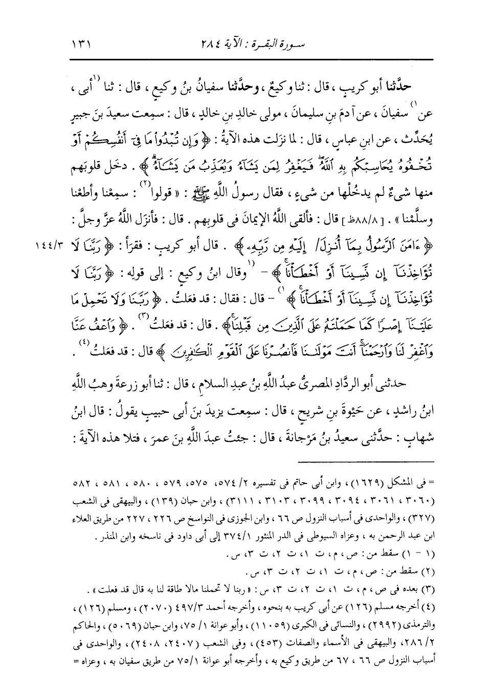 حَدَّثَنَا أَبُو كُرَيْبٍ، قَالَ: ثنا وَكِيعٌ، وَحَدَّثنا سُفْيَانُ بْنُ وَكِيعٍ، قَالَ: ثنا سُفْيَانُ، عَنْ آدَمَ بْنِ سُلَيْمَانَ، مَوْلَى خَالِدِ بْنِ خَالِدٍ، قَالَ: سَمِعْتُ سَعِيدَ بْنَ جُبَيْرٍ، يُحَدِّثُ عَنِ ابْنِ عَبَّاسٍ، قَالَ: لَمَّا نَزَلَتْ هَذِهِ الْآيَةُ: {§إِنْ تُبْدُوا مَا فِي أَنْفُسِكُمْ أَوْ تُخْفُوهُ يُحَاسِبْكُمْ بِهِ اللَّهُ فَيَغْفِرُ لِمَنْ يَشَاءُ وَيُعَذِّبُ مَنْ يَشَاءُ} [البقرة: 284] دَخَلَ قُلُوبَهُمْ مِنْهَا شَيْءٌ لَمْ يَدْخُلْهَا مِنْ شَيْءٍ، فَقَالَ رَسُولُ اللَّهِ صَلَّى اللهُ عَلَيْهِ وَسَلَّمَ: «سَمِعْنَا وَأَطَعْنَا وَسَلَّمْنَا» قَالَ: فَأَلْقَى اللَّهُ عَزَّ وَجَلَّ الْإِيمَانَ فِي قُلُوبِهِمْ، قَالَ: فَأَنْزَلَ اللَّهُ عَزَّ وَجَلَّ: {آمَنَ الرَّسُولُ بِمَا أُنْزِلَ إِلَيْهِ مِنْ رَبِّهِ} [البقرة: 285] قَالَ أَبُو كُرَيْبٍ: فَقَرَأَ: {رَبَّنَا لَا تُؤَاخِذْنَا إِنْ نَسِينَا أَوْ أَخْطَأْنَا} [البقرة: 286] قَالَ: فَقَالَ: «قَدْ فَعَلْتُ» {رَبَّنَا وَلَا تَحْمِلْ عَلَيْنَا إِصْرًا كَمَا حَمَلْتَهُ عَلَى الَّذِينَ مِنْ قَبْلِنَا} [البقرة: 286] قَالَ: «قَدْ فَعَلْتُ» {رَبَّنَا وَلَا تُحَمِّلْنَا مَا لَا طَاقَةَ لَنَا بِهِ} [البقرة: 286] قَالَ: «قَدْ فَعَلْتُ» {وَاعْفُ عَنَّا وَاغْفِرْ لَنَا وَارْحَمْنَا أَنْتَ مَوْلَانَا فَانْصُرْنَا عَلَى الْقَوْمِ الْكَافِرِينَ} [البقرة: 286] قَالَ: «قَدْ فَعَلْتُ»