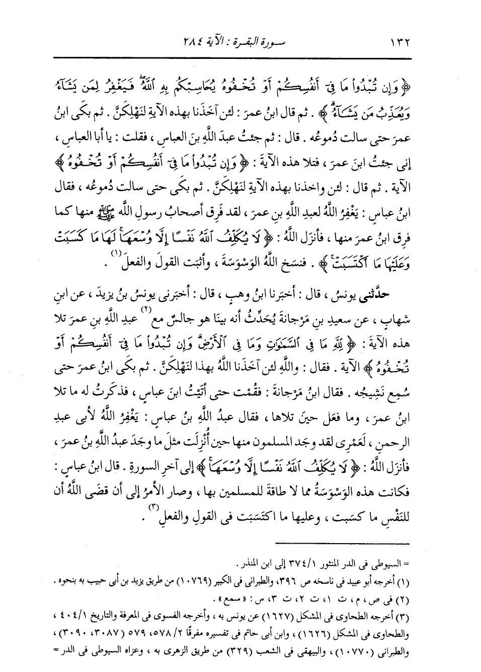 حَدَّثَنِي يُونُسُ، قَالَ: أَخْبَرَنَا ابْنُ وَهْبٍ، قَالَ: أَخْبَرَنِي يُونُسُ بْنُ يَزِيدَ، عَنِ ابْنِ شِهَابٍ، عَنْ سَعِيدِ بْنِ مَرْجَانَةَ يُحَدِّثُ: أَنَّهُ بَيْنَا هُوَ جَالِسٌ سَمِعَ عَبْدَ اللَّهِ بْنَ عُمَرَ تَلَا هَذِهِ الْآيَةَ: {لِلَّهِ مَا فِي السَّمَوَاتِ وَمَا فِي الْأَرْضِ §وَإِنْ تُبْدُوا مَا فِي أَنْفُسِكُمْ أَوْ تُخْفُوهُ} الْآيَةَ، فَقَالَ: وَاللَّهِ لَئِنْ أَخَذَنَا اللَّهُ بِهَذَا لَنُهْلَكَنَّ، ثُمَّ بَكَى ابْنُ عُمَرَ حَتَّى سُمِعَ نَشِيجُهُ، فَقَالَ ابْنُ مَرْجَانَةَ: فَقُمْتُ حَتَّى أَتَيْتُ ابْنَ عَبَّاسٍ، فَذَكَرْتُ لَهُ مَا تَلَا ابْنُ عُمَرَ، وَمَا فَعَلَ حِينَ تَلَاهَا، فَقَالَ عَبْدُ اللَّهِ بْنُ عَبَّاسٍ: «يَغْفِرُ اللَّهُ لِأَبِي عَبْدِ الرَّحْمَنِ، لَعَمْرِي لَقَدْ وَجَدَ الْمُسْلِمُونَ مِنْهَا حِينَ أُنْزِلَتْ مِثْلَ مَا وَجَدَ عَبْدُ اللَّهِ بْنُ عُمَرَ» فَأَنْزَلَ اللَّهُ بَعْدَهَا: {لَا يُكَلِّفُ اللَّهُ نَفْسًا إِلَّا وُسْعَهَا} [البقرة: 286] إِلَى آخِرِ السُّورَةِ. قَالَ ابْنُ عَبَّاسٍ: فَكَانَتْ هَذِهِ الْوَسْوَسَةُ مِمَّا لَا طَاقَةَ لِلْمُسْلِمِينَ بِهَا، وَصَارَ الْأَمْرُ إِلَى أَنْ قَضَى اللَّهُ عَزَّ وَجَلَّ أَنَّ لِلنَّفْسِ مَا كَسَبَتْ وَعَلَيْهَا مَا اكْتَسَبَتْ فِي الْقَوْلِ وَالْفِعْلِ "