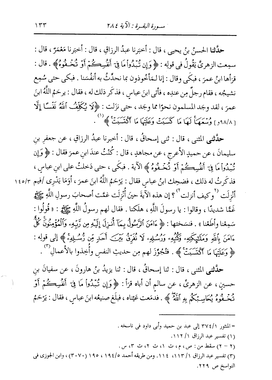 حَدَّثَنِي الْمُثَنَّى، قَالَ: ثنا إِسْحَاقُ، قَالَ: ثنا يَزِيدُ بْنُ هَارُونَ، عَنْ سُفْيَانَ بْنِ حُسَيْنٍ، عَنِ الزُّهْرِيِّ، عَنْ سَالِمٍ، أَنَّ أَبَاهُ، قَرَأَ: {§وَإِنْ تُبْدُوا مَا فِي أَنْفُسِكُمْ أَوْ تُخْفُوهُ يُحَاسِبْكُمْ بِهِ اللَّهُ} [البقرة: 284] فَدَمَعَتْ عَيْنُهُ. فَبَلَغَ صَنِيعُهُ ابْنَ عَبَّاسٍ فَقَالَ: " يَرْحَمُ -[134]- اللَّهُ أَبَا عَبْدِ الرَّحْمَنِ، لَقَدْ صَنَعَ كَمَا صَنَعَ أَصْحَابُ رَسُولِ اللَّهِ صَلَّى اللهُ عَلَيْهِ وَسَلَّمَ حِينَ أُنْزِلَتْ، فَنَسَخَتْهَا الْآيَةُ الَّتِي بَعْدَهَا: {لَا يُكَلِّفُ اللَّهُ نَفْسًا إِلَّا وُسْعَهَا} [البقرة: 286] "