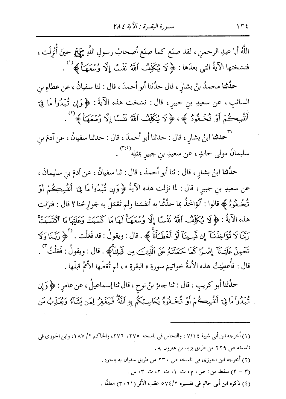 حَدَّثَنَا مُحَمَّدُ بْنُ بَشَّارٍ، قَالَ أَبُو أَحْمَدَ، قَالَ: ثنا سُفْيَانُ، عَنْ عَطَاءِ بْنِ السَّائِبِ، عَنْ سَعِيدِ بْنِ جُبَيْرٍ، قَالَ: " نَسَخَتْ هَذِهِ الْآيَةَ: {§إِنْ تُبْدُوا مَا فِي أَنْفُسِكُمْ أَوْ تُخْفُوهُ} [البقرة: 284] {لَا يُكَلِّفُ اللَّهُ نَفْسًا إِلَّا وُسْعَهَا} [البقرة: 286] "
