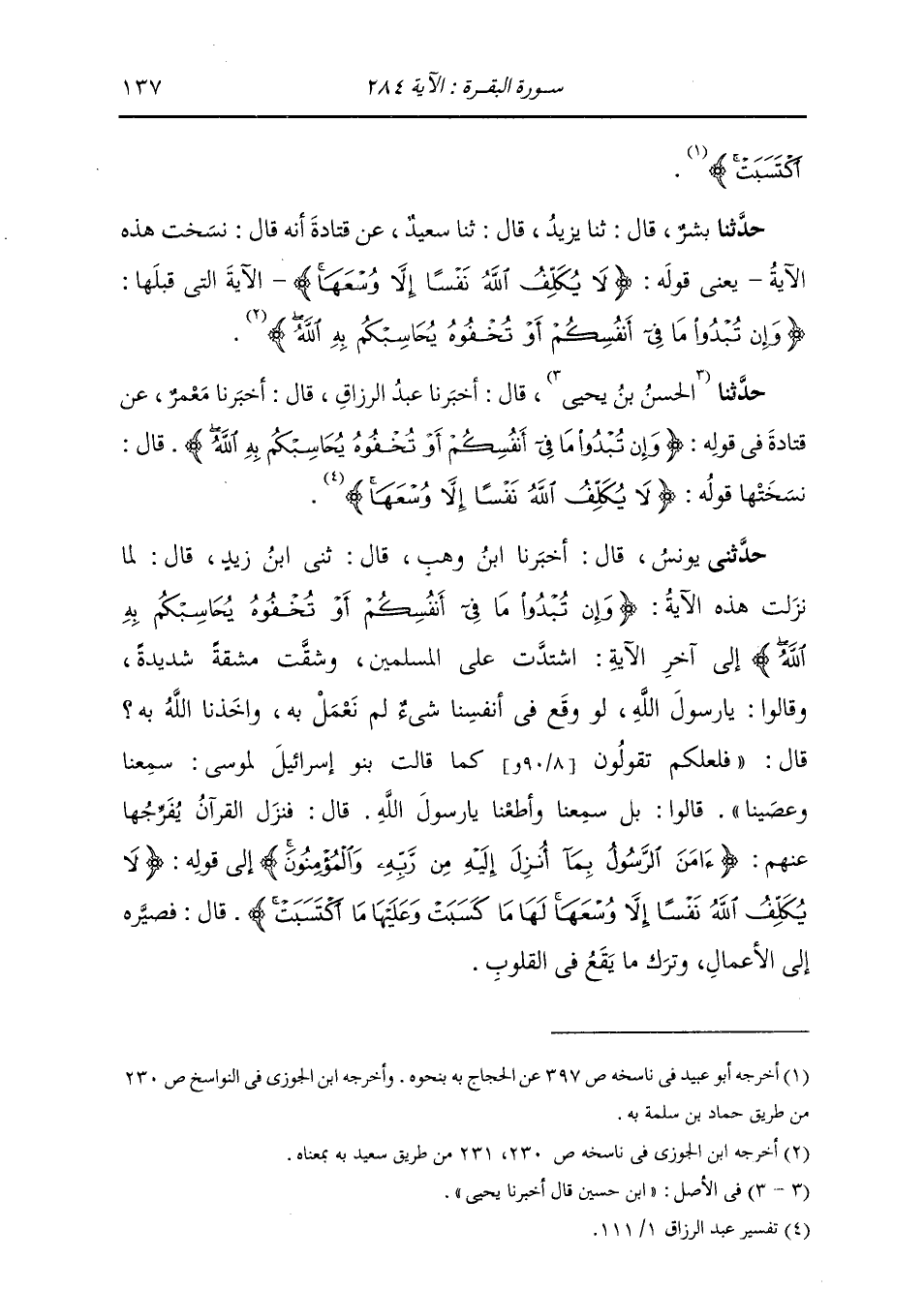 حَدَّثَنَا بِشْرٌ، قَالَ: ثنا يَزِيدُ، قَالَ: ثنا سَعِيدٌ، عَنْ قَتَادَةَ، أَنَّهُ قَالَ: " §نَسَخَتْ هَذِهِ الْآيَةُ، يَعْنِي قَوْلَهُ: {لَا يُكَلِّفُ اللَّهُ نَفْسًا إِلَّا وُسْعَهَا} [البقرة: 286] الْآيَةَ الَّتِي كَانَتْ قَبْلَهَا: {إِنْ تُبْدُوا مَا فِي أَنْفُسِكُمْ أَوْ تُخْفُوهُ يُحَاسِبْكُمْ بِهِ اللَّهُ} [البقرة: 284] "