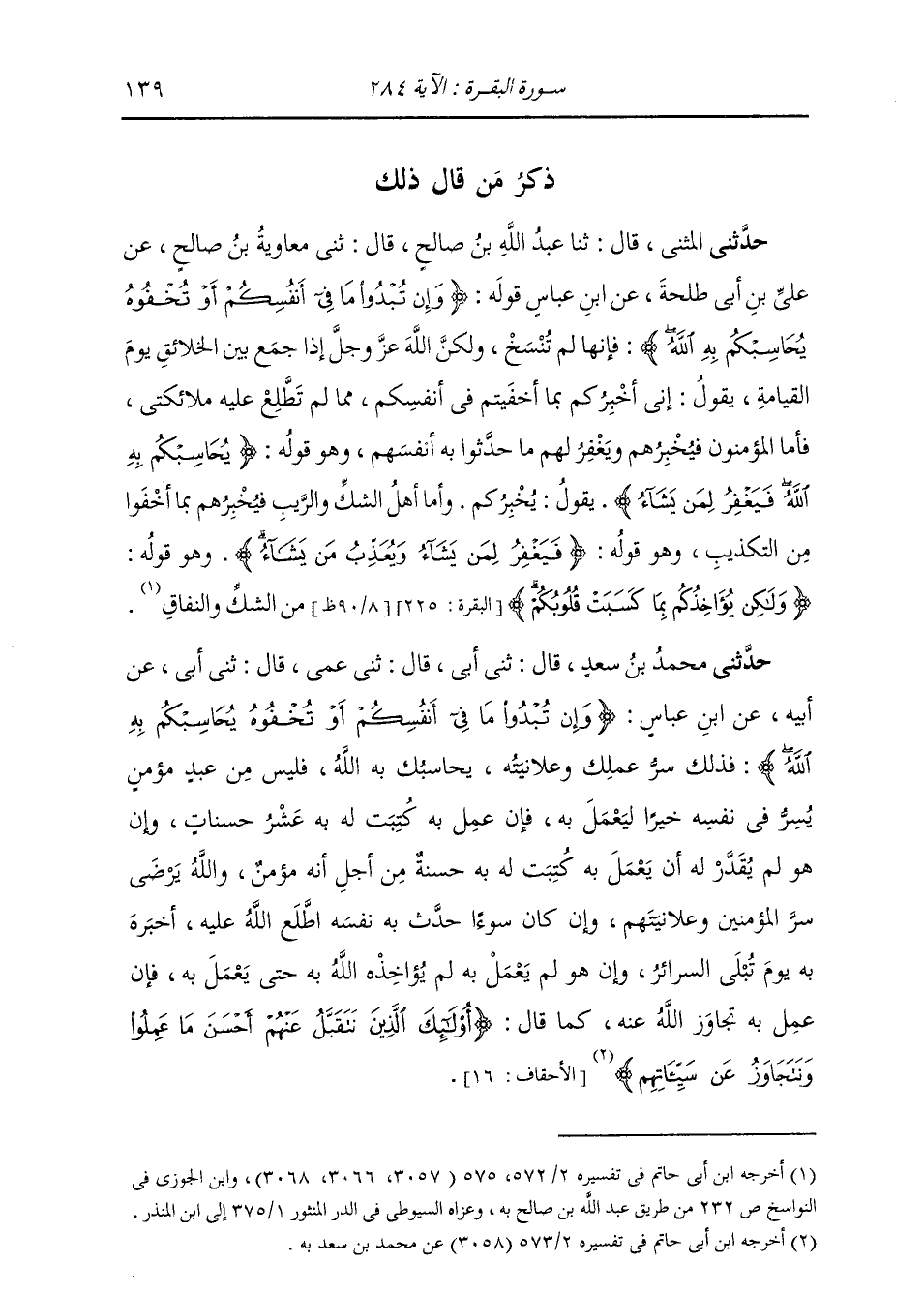 ذِكْرُ مَنْ قَالَ ذَلِكَ: حَدَّثَنِي الْمُثَنَّى، قَالَ: ثنا عَبْدُ اللَّهِ بْنُ صَالِحٍ، قَالَ: ثني مُعَاوِيَةُ، عَنْ عَلِيٍّ، عَنِ ابْنِ عَبَّاسٍ، قَوْلُهُ: {§إِنْ تُبْدُوا مَا فِي أَنْفُسِكُمْ أَوْ تُخْفُوهُ يُحَاسِبْكُمْ بِهِ اللَّهُ} [البقرة: 284] " فَإِنَّهَا لَمْ تُنْسَخْ، وَلَكِنَّ اللَّهَ عَزَّ وَجَلَّ إِذَا جَمَعَ الْخَلَائِقَ يَوْمَ الْقِيَامَةِ، يَقُولُ اللَّهُ عَزَّ وَجَلَّ: «إِنِّي أُخْبِرُكُمْ بِمَا أَخْفَيْتُمْ فِي أَنْفُسِكُمْ مِمَّا لَمْ تَطَّلِعُ عَلَيْهِ مَلَائِكَتِي، فَأَمَّا الْمُؤْمِنُونَ فَيُخْبِرُهُمْ وَيَغْفِرُ لَهُمْ مَا حَدَّثُوا بِهِ أَنْفُسَهُمْ، وَهُوَ قَوْلُهُ» : {يُحَاسِبْكُمْ بِهِ اللَّهُ} [البقرة: 284] يَقُولُ: «يُخْبِرُكُمْ، وَأَمَّا أَهْلُ الشَّكِّ وَالرَّيْبِ، فَيُخْبِرُهُمْ بِمَا أَخْفَوْا مِنَ التَّكْذِيبِ، وَهُوَ قَوْلُهُ» : {فَيَغْفِرُ لِمَنْ يَشَاءُ وَيُعَذِّبُ مَنْ يَشَاءُ} [البقرة: 284] وَهُوَ قَوْلُهُ: {وَلَكِنْ يُؤَاخِذُكُمْ بِمَا كَسَبَتْ قُلُوبُكُمْ} [البقرة: 225] «مِنَ الشَّكِّ وَالنِّفَاقِ»