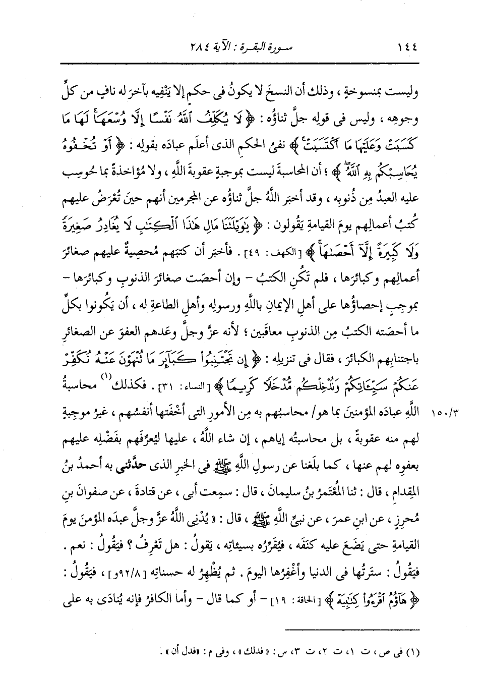 حَدَّثَنِي بِهِ، أَحْمَدُ بْنُ الْمِقْدَامِ، قَالَ: ثنا الْمُعْتَمِرُ بْنُ سُلَيْمَانَ، قَالَ: سَمِعْتُ أَبِي، عَنْ قَتَادَةَ، عَنْ صَفْوَانَ بْنِ مُحْرِزٍ، عَنِ ابْنِ عُمَرَ، عَنْ نَبِيِّ اللَّهِ صَلَّى اللهُ عَلَيْهِ وَسَلَّمَ قَالَ: " §يُدْنِي اللَّهُ عَبْدَهُ الْمُؤْمِنَ يَوْمَ الْقِيَامَةِ حَتَّى يَضَعَ عَلَيْهِ كَنَفَهُ فَيُقَرِّرُهُ بِسَيِّئَاتِهِ يَقُولُ: هَلْ تَعْرِفُ؟ فَيَقُولُ: نَعَمْ، فَيَقُولُ: سَتَرْتُهَا فِي الدُّنْيَا وَأَغْفِرُهَا الْيَوْمَ، ثُمَّ يُظْهِرُ لَهُ حَسَنَاتِهِ، فَيَقُولُ: هَاؤُمُ اقْرَءُوا كِتَابِيَهْ أَوْ كَمَا قَالَ: وَأَمَّا الْكَافِرُ، فَإِنَّهُ يُنَادِي بِهِ عَلَى -[145]- رُءُوسِ الْأَشْهَادِ "