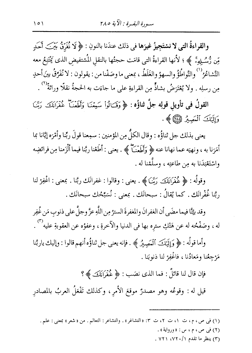 §الْقَوْلُ فِي تَأْوِيلِ قَوْلِهِ تَعَالَى: {وَقَالُوا سَمِعْنَا وَأَطَعْنَا غُفْرَانَكَ رَبَّنَا وَإِلَيْكَ الْمَصِيرُ} [البقرة: 285] يَعْنِي بِذَلِكَ جَلَّ ثناؤُهُ: وَقَالَ الْكَلُّ مِنَ الْمُؤْمِنِينَ: {سَمِعْنَا} [البقرة: 93] قَوْلَ رَبِّنَا، وَأَمْرَهُ إِيَّانَا بِمَا أَمَرَنَا بِهِ، وَنَهْيَهُ عَمَّا نَهَانَا عَنْهُ، {وَأَطَعْنَا} [البقرة: 285] يَعْنِي أَطَعْنَا رَبَّنَا فِيمَا أَلْزَمَنَا مِنْ فَرَائِضِهِ، وَاسْتعَبْدَنَا بِهِ مِنْ طَاعَتِهِ، وَسَلَّمْنَا لَهُ: وَقَوْلُهُ: {غُفْرَانَكَ رَبَّنَا} [البقرة: 285] يَعْنِي: وَقَالُوا: غُفْرَانَكَ رَبَّنَا، بِمَعْنَى: اغْفِرْ لَنَا رَبَّنَا غُفْرَانَكَ، كَمَا يُقَالُ: سُبْحَانَكَ، بِمَعْنَى نُسَبِّحُكَ سُبْحَانَكَ. وَقَدْ بَيَّنَّا فِيمَا مَضَى أَنَّ الْغُفْرَانَ وَالْمَغْفِرَةَ: السِّتْرُ مِنَ اللَّهِ عَلَى ذُنُوبِ مَنْ غَفَرَ لَهُ، وَصَفْحُهُ لَهُ عَنْ هَتْكِ سِتْرِهِ بِهَا فِي الدُّنْيَا وَالْآخِرَةِ، وَعَفْوُهُ عَنِ الْعُقُوبَةِ عَلَيْهِ، وَأَمَّا قَوْلُهُ: {وَإِلَيْكَ الْمَصِيرُ} [البقرة: 285] فَإِنَّهُ يَعْنِي جَلَّ ثناؤُهُ أَنَّهُمْ قَالُوا: وَإِلَيْكَ يَا رَبَّنَا مَرْجُعَنَا وَمَعَادُنَا فَاغْفِرْ لَنَا ذُنُوبَنَا. فَإِنْ قَالَ لَنَا قَائِلٌ: فَمَا الَّذِي نَصَبَ قَوْلَهَ: {غُفْرَانَكَ} [البقرة: 285] ؟ قِيلَ لَهُ: وقُوعُهُ وَهُوَ مَصْدَرٌ مَوْقِعَ الْأَمْرِ، وَكَذَلِكَ تَفْعَلُ الْعَرَبُ بِالْمَصَادِرِ